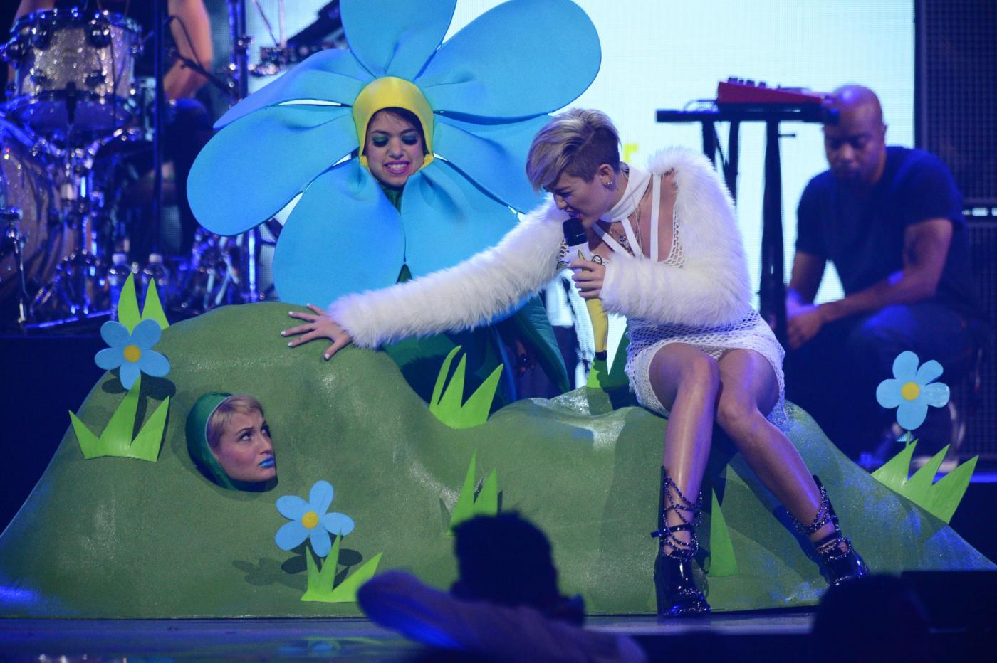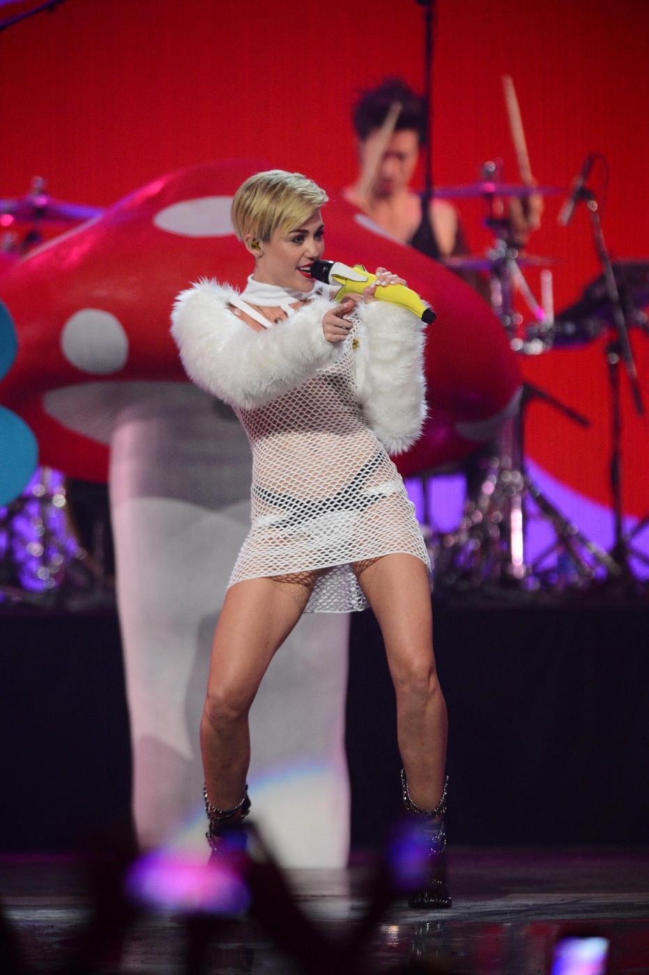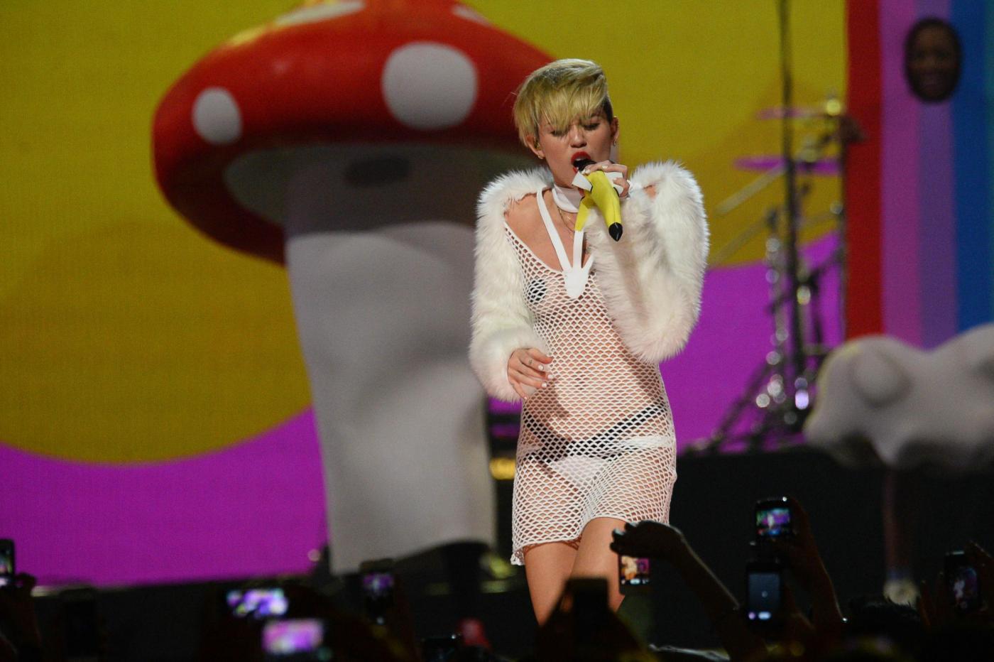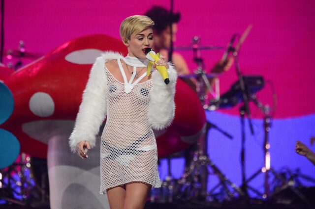 LAS VEGAS – Miley Cyrus sale sul palco dell’iHeartRadio Music Festival 2013 a Las Vegas coperta solo da un maglione a rete, un tanga e due adesivi a coprire i capezzoli. La ex reginetta Disney che continua a fare scandalo e a suscitare diverse critiche, in mano ha un microfono fatto a forma di banana.