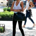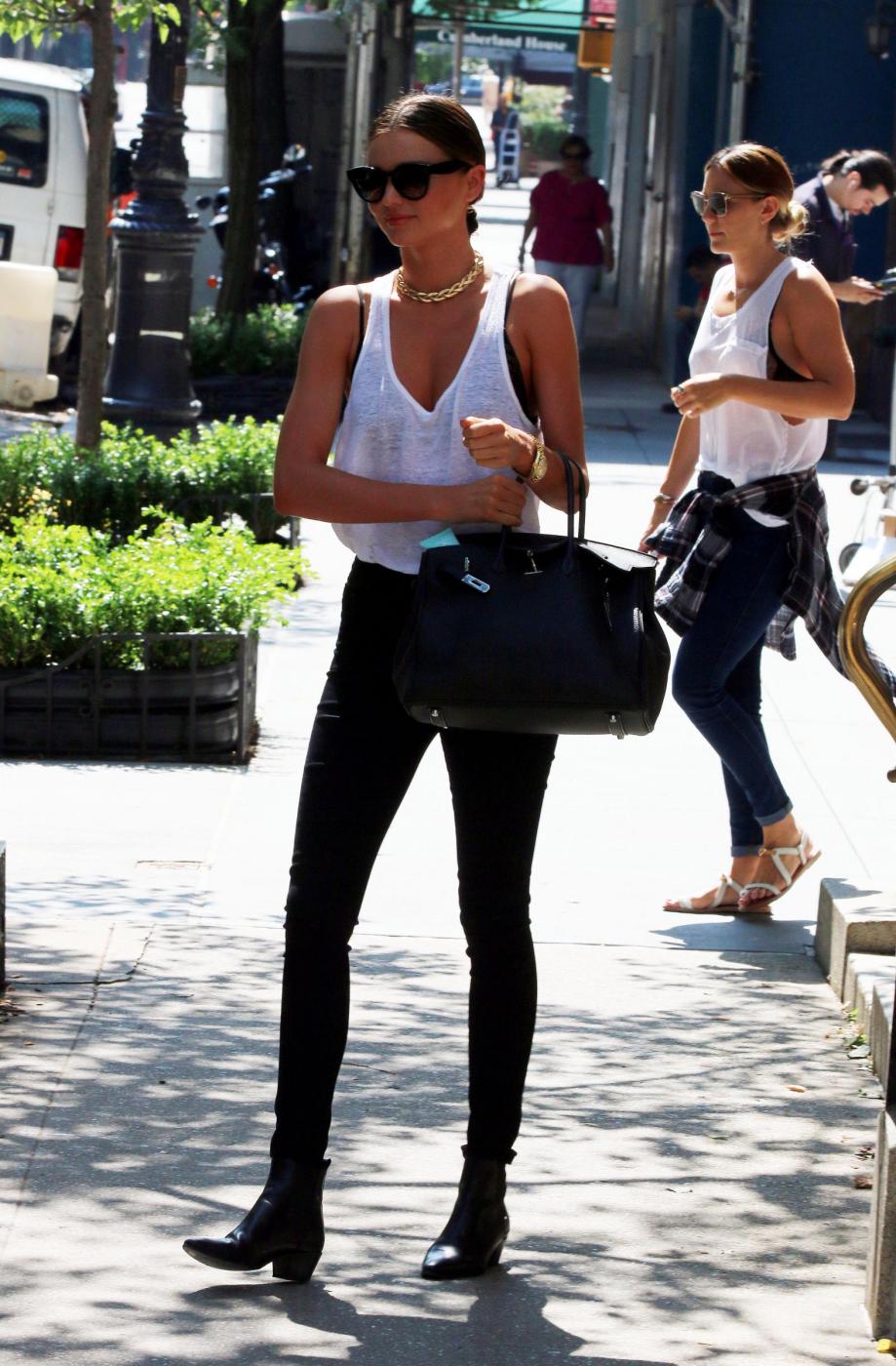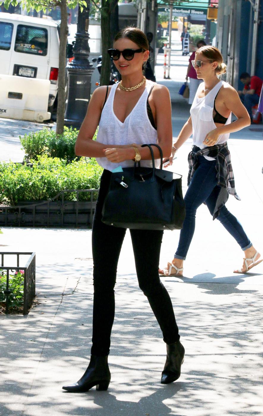 USA – Miranda Kerr è stata avvistata a passeggio per le strade di New York. La supermodella australiana, famosa per essere stata dal 2007 al 2013 uno degli Angeli di Victoria’s Secret, sfoggiava un look semplice quanto chic: skinny jeans neri, canotta bianca con reggiseno scuro a vista, stivaletti camperos ai piedi, più l’inconfondibile borsa Hermes.
