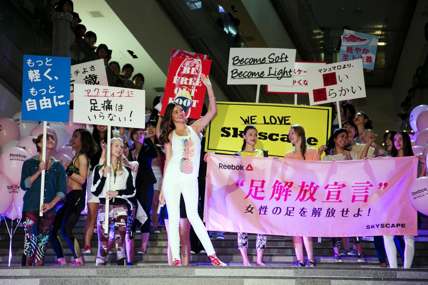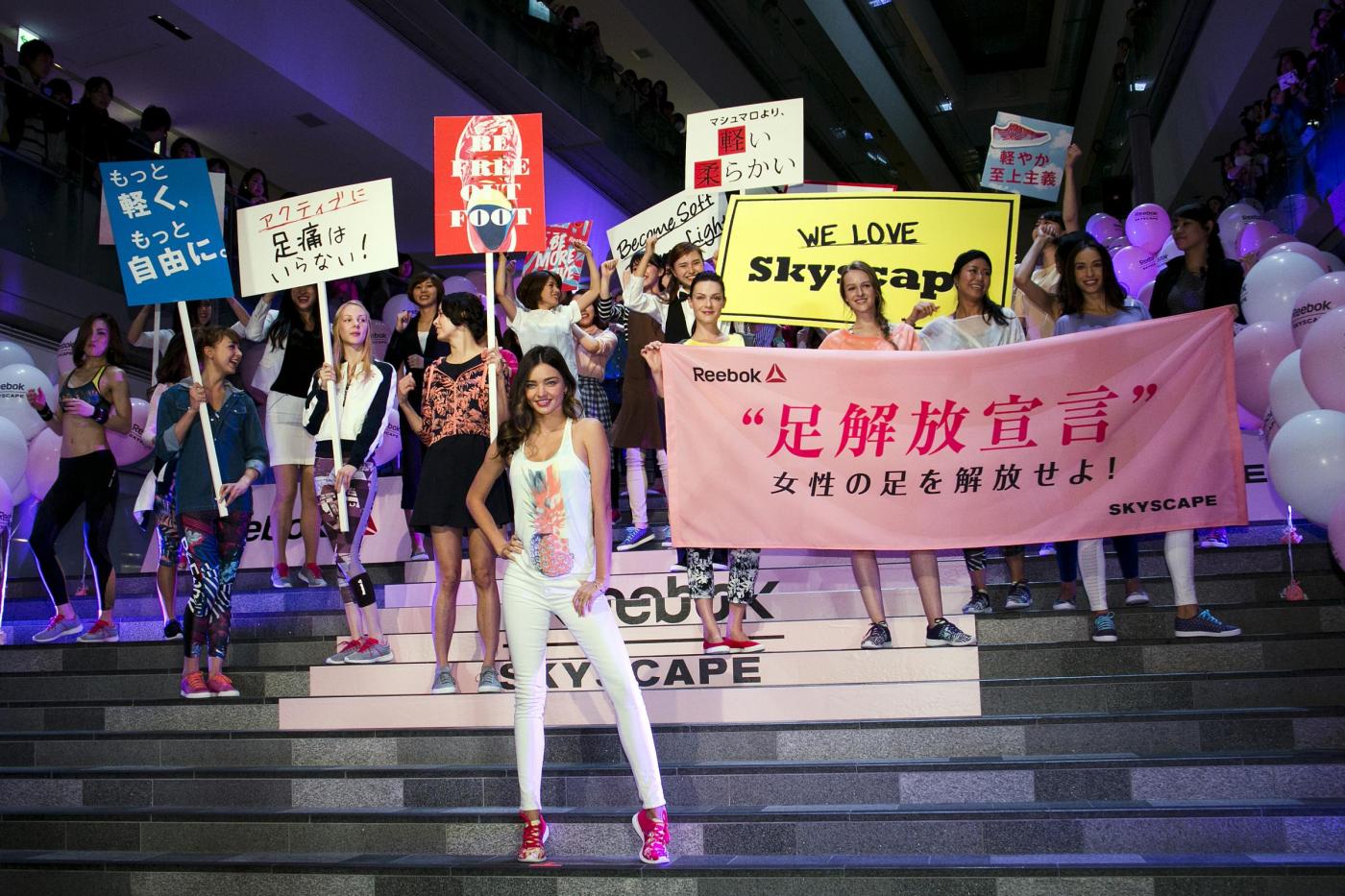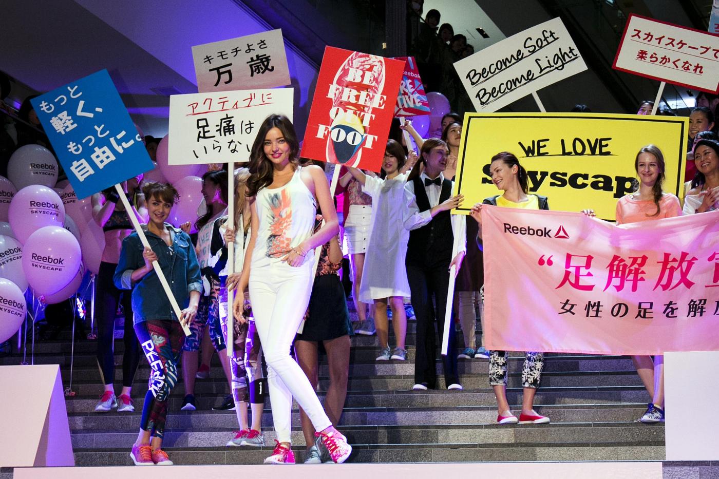 TOKYO – Miranda Kerr sfoggia insieme ad altre modelle le nuove Reebok Skyscape. La modella australiana ha presentato le nuove scarpe all’ Omotesando Hills ed è apparsa sorridente.