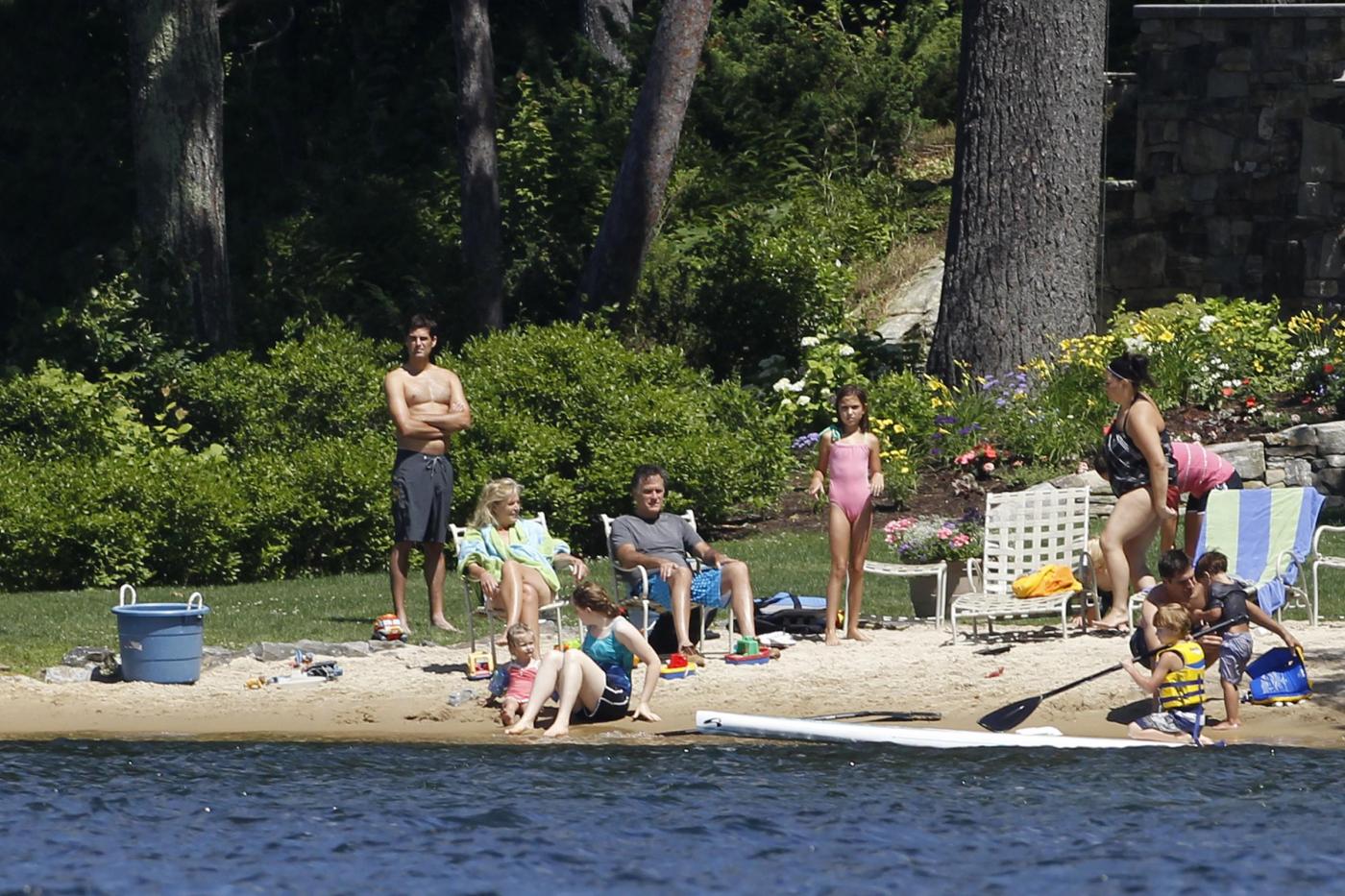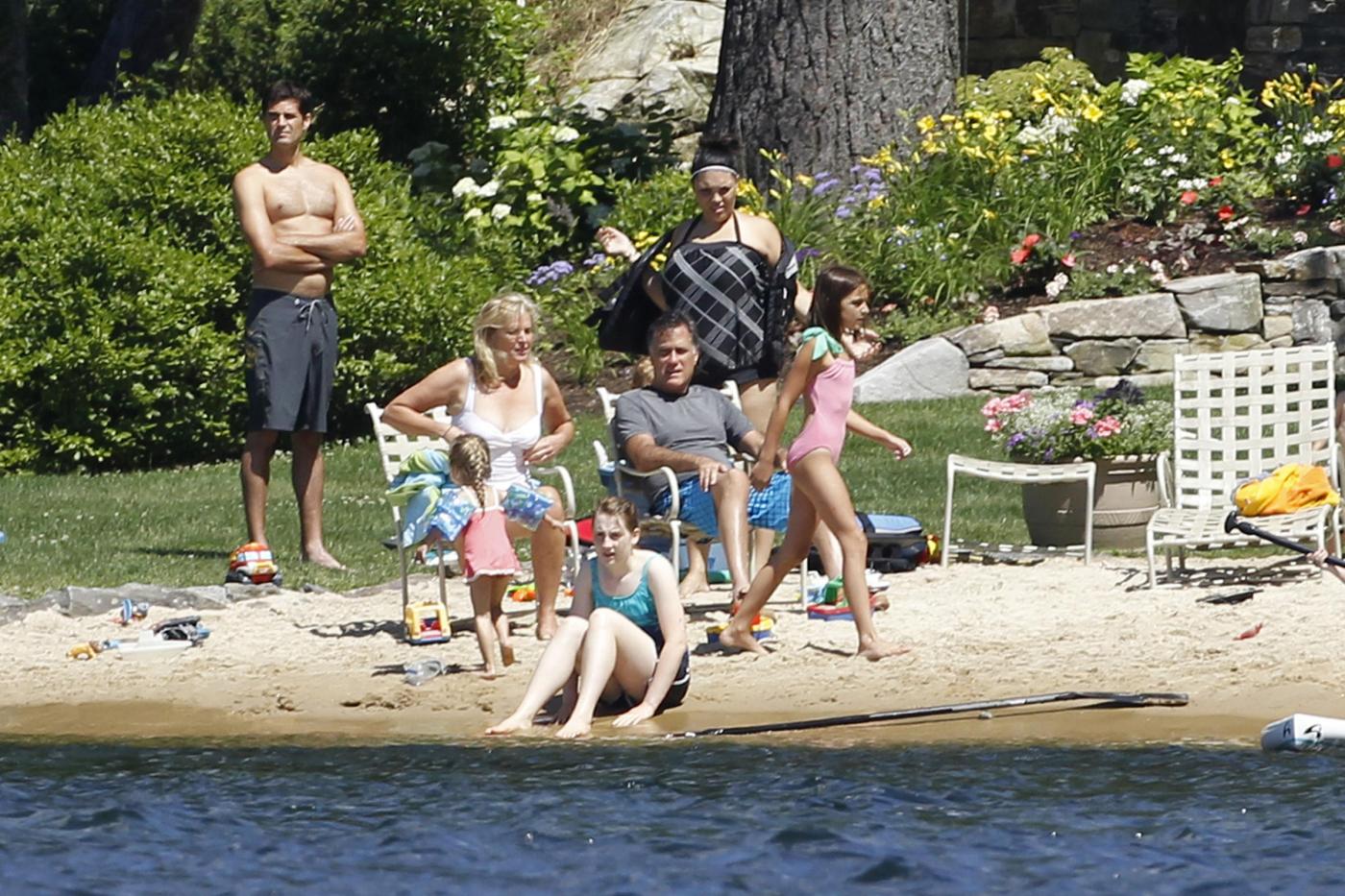 Republican presidential candidate, former Massachusetts Gov. Mitt Romney, his wife Ann, and family members sit on the beach in front of their vacation home on Lake Winnipesaukee in Wolfeboro, N.H., Monday, July 2, 2012. (AP Photo/Charles Dharapak)