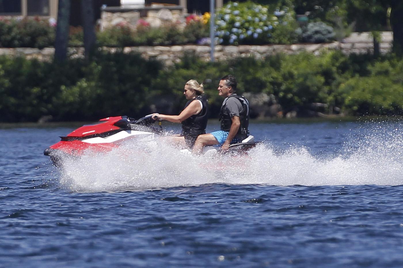 Republican presidential candidate, former Massachusetts Gov. Mitt Romney and wife Ann Romney jet ski on Lake Winnipesaukee in Wolfeboro, N.H., Monday, July 2, 2012, where Romney has a vacation home. (AP Photo/Charles Dharapak