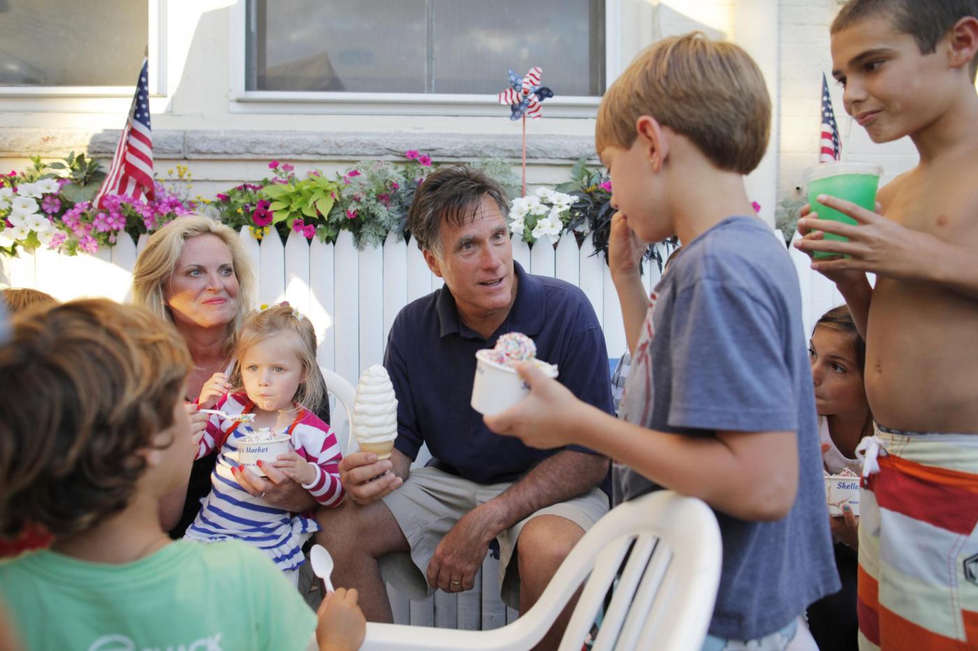 Republican presidential candidate Mitt Romney, center, and his wife Ann, left, have Bailey's Bubble ice cream in Wolfeboro, N.H., Monday, July 2, 2012, as they continue their vacation from the campaign trail. (AP Photo/Charles Dharapak)