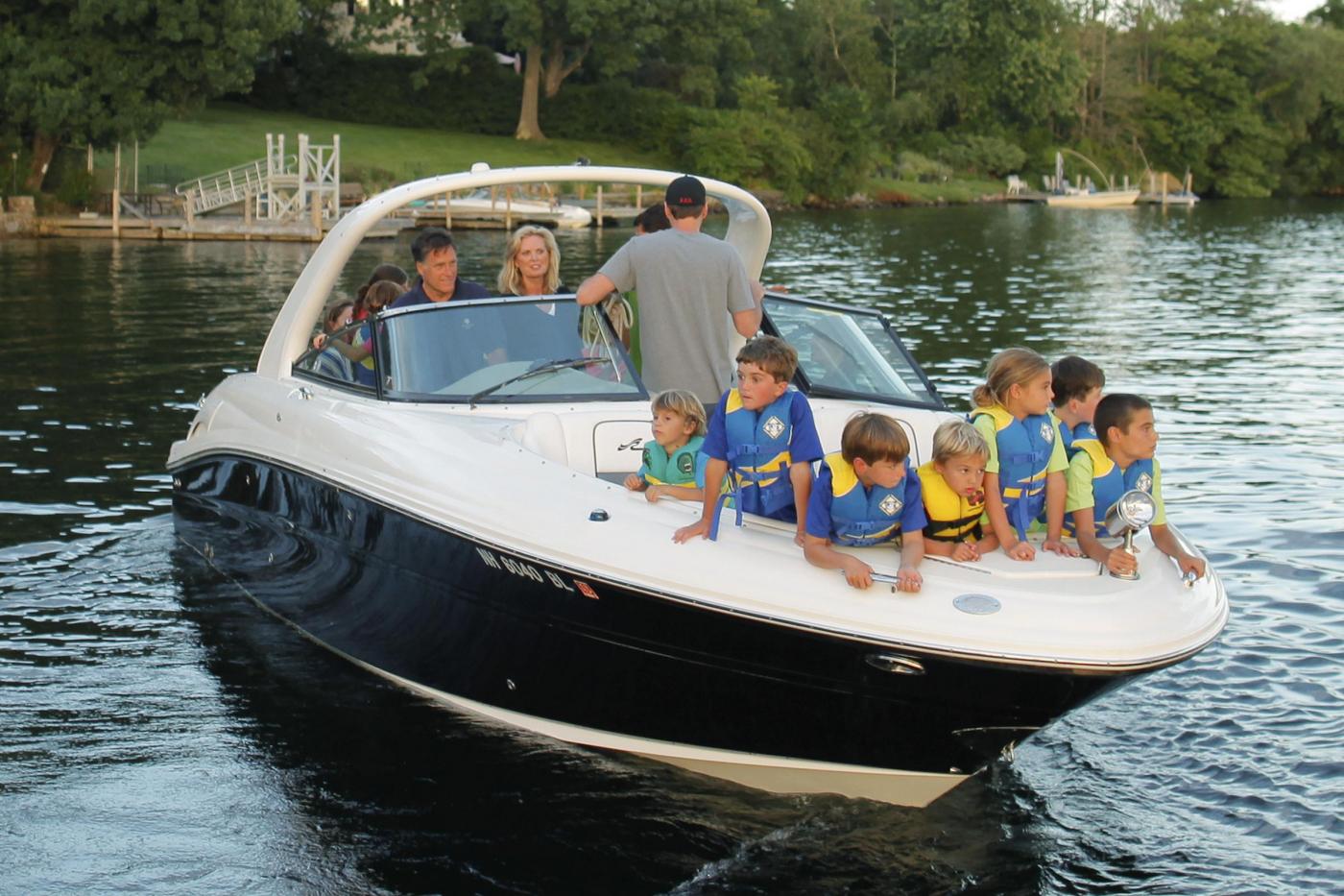 Republican presidential candidate Mitt Romney, rear left, and his wife Ann, with their grandchildren in the bow of their boat, depart from the public docks on Lake Winnipesaukee in Wolfeboro, N.H., Monday, July 2, 2012, as they continue their vacation from the campaign trail. (AP Photo/Charles Dharapak)