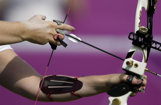 Amy Oliver Britain's Amy Oliver has her nails painted in the color of her country's flag as she shoots during the women's archery team competition at the 2012 Summer Olympics, Sunday, July 29, 2012, in London. (AP Photo/Marcio Jose Sanchez) Only Italy -- LaPresse --