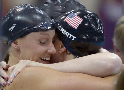 Dana VollmerUnited States' swimmer Dana Vollmer, left, hugs teammate Alison Schmitt after their gold medal win in the women's 4 x 100-meter medley relay final at the Aquatics Centre in the Olympic Park during the 2012 Summer Olympics in London, Saturday, Aug. 4, 2012. (AP Photo/Mark J. Terrill) Only Italy -- LaPresse --