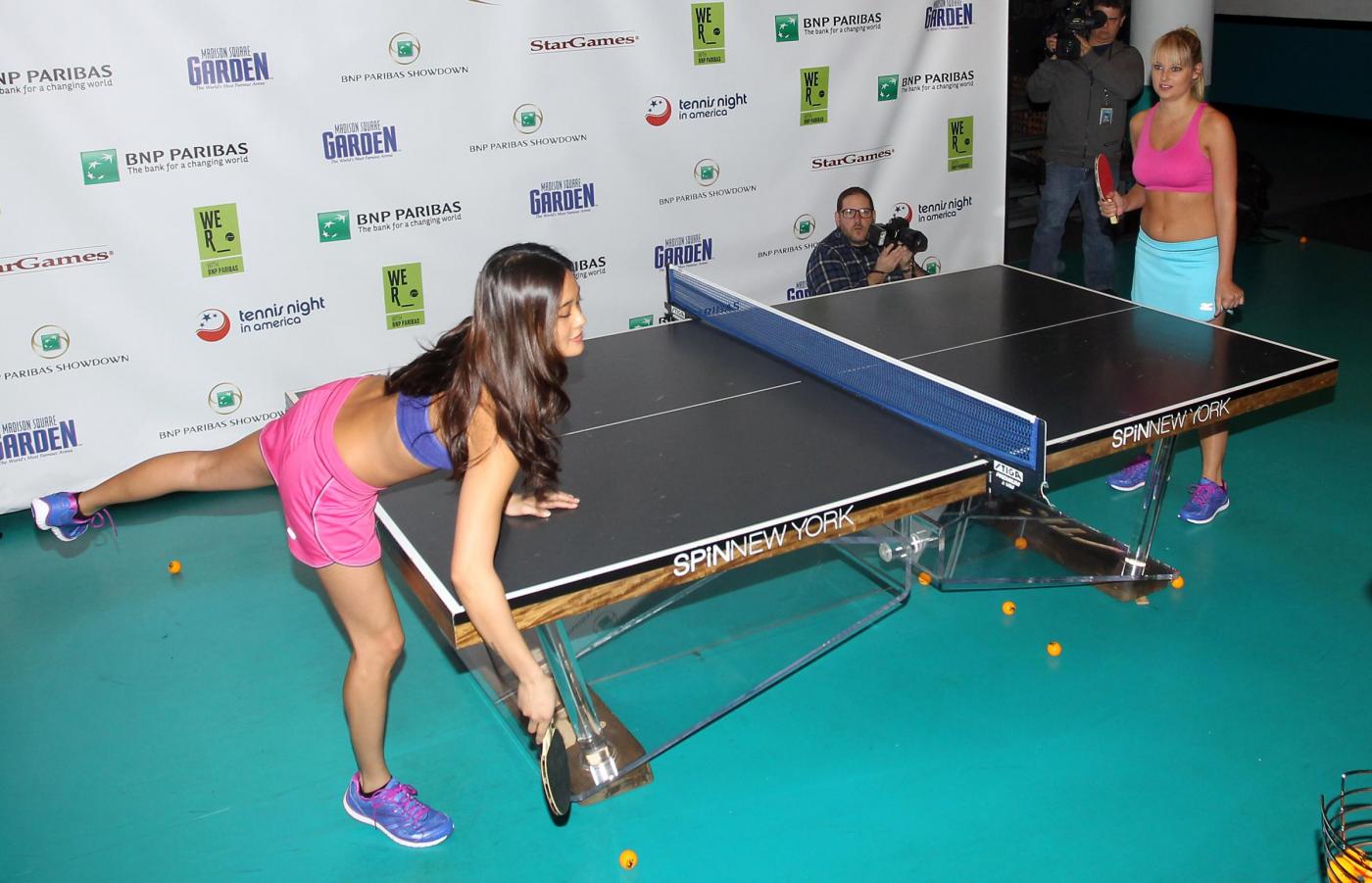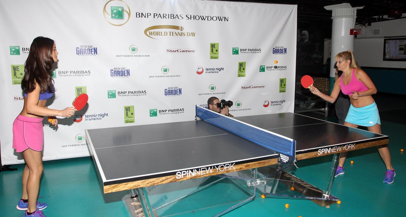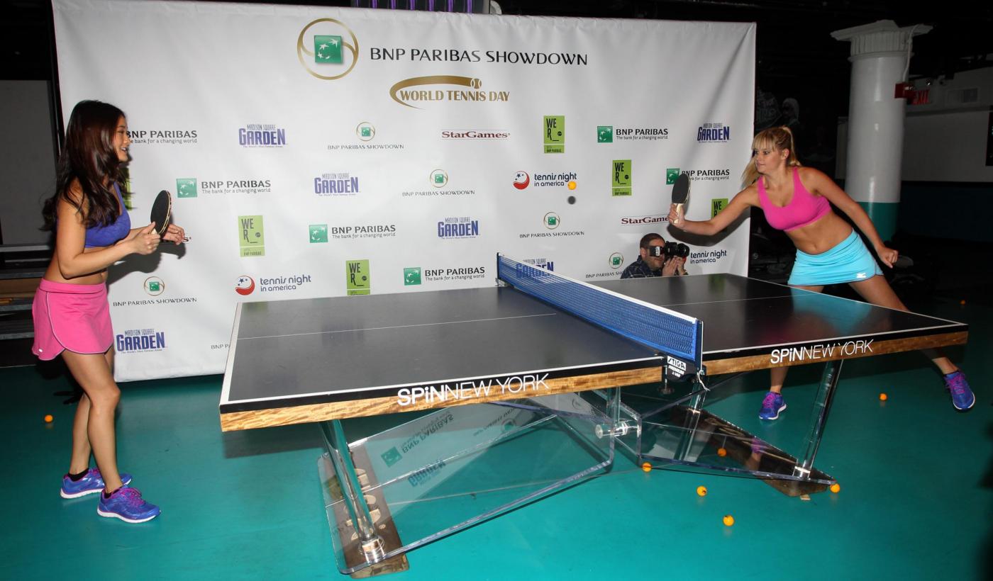 Jarah Mariano e Genevieve Morton giocano a ping pong al Madison Square Garden di New York. Qui, sono attesi i protagonisti del grande tennis come Rafael Nadal e Serena Williams