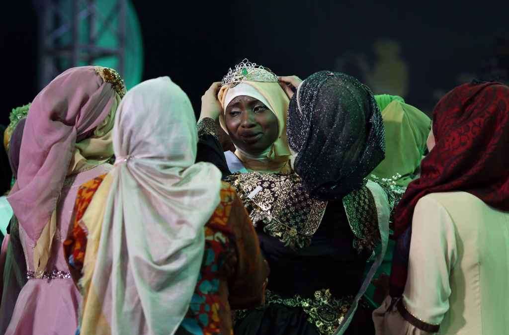 Nigerian Obabiyi Aishah Ajibola (C) reacts after being named World Muslimah 2013 during the third Annual Award of World Muslimah in Jakarta September 18, 2013. Twenty Muslim women from Indonesia, Malaysia, Brunei Darussalam and Nigeria competed on Wednesday in the finals of the pageant, held exclusively for Muslim women, which assessed not only the contestants' appearances but also their piety and religious knowledge. REUTERS/Beawiharta (INDONESIA - Tags: SOCIETY RELIGION TPX IMAGES OF THE DAY)