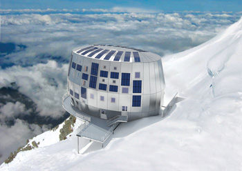 L’imponente struttura a forma d’uovo, prenderà il posto del vecchio rifugio che risale agli anni ’60. E’ stata costruita con materiale eco-bio e dotata di moderni impianti fotovoltaici e termici, in assoluto rispetto delle nuove norme ambientali. Il rifugio vive in totale autonomia ed è dotato anche di un sistema di trattamento delle acque usate. Per ridurre il’impatto, la struttura interna è realizzata in legno locale. “E’ un cantiere complicato e ambizioso – ha spiegato Georges Elzière, presidente della Federazione Francese dei Club Alpini e di Montagna – in cui si utilizzano tecniche innovative. Tuttavia, credo sia un po’ come l’alpinismo, appassionante proprio perché difficile”.