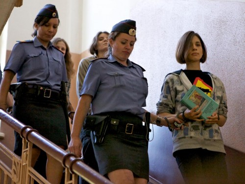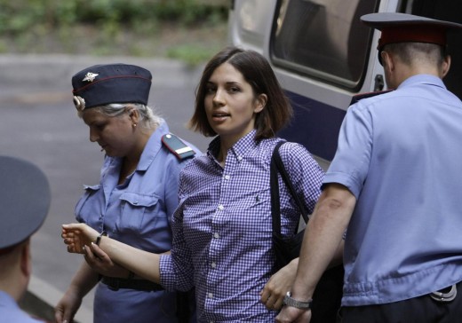LaPresse30-07-2012CronacaPussy Riot, le ragazze punk in carcere per la preghiera anti-PutinNadezhda Tolokonnikova, center, a member of feminist punk group Pussy Riot is escorted to a court room in Moscow, Russia, Monday, July 30, 2012. Three members of the band are facing trial for performing a "punk prayer" against Vladimir Putin from a pulpit of Moscow's main cathedral before Russia's presidential election in March, in which he won a third term.