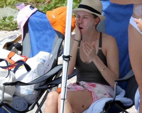In uno scatto, la Watts si mette la crema (protettiva o abbronzante?) sul volto. Davvero una vacanza tutta “sole e famiglia” (Ap/LaPresse)