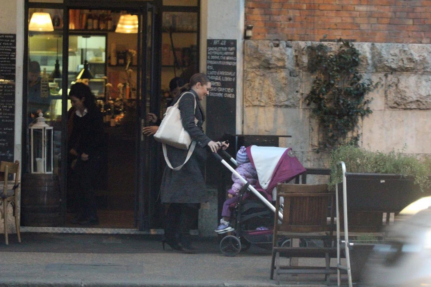 Natalia Titova, a passeggio per Roma con la suocera e con le sue due figlie, Sofia e Vittoria Sidney, esce da un ristorante dove ha fatto una sosta per far mangiare Vittoria, la più piccola tra le sue due figlie.
