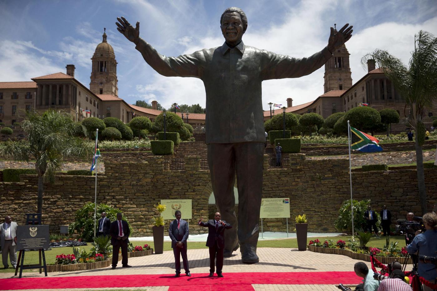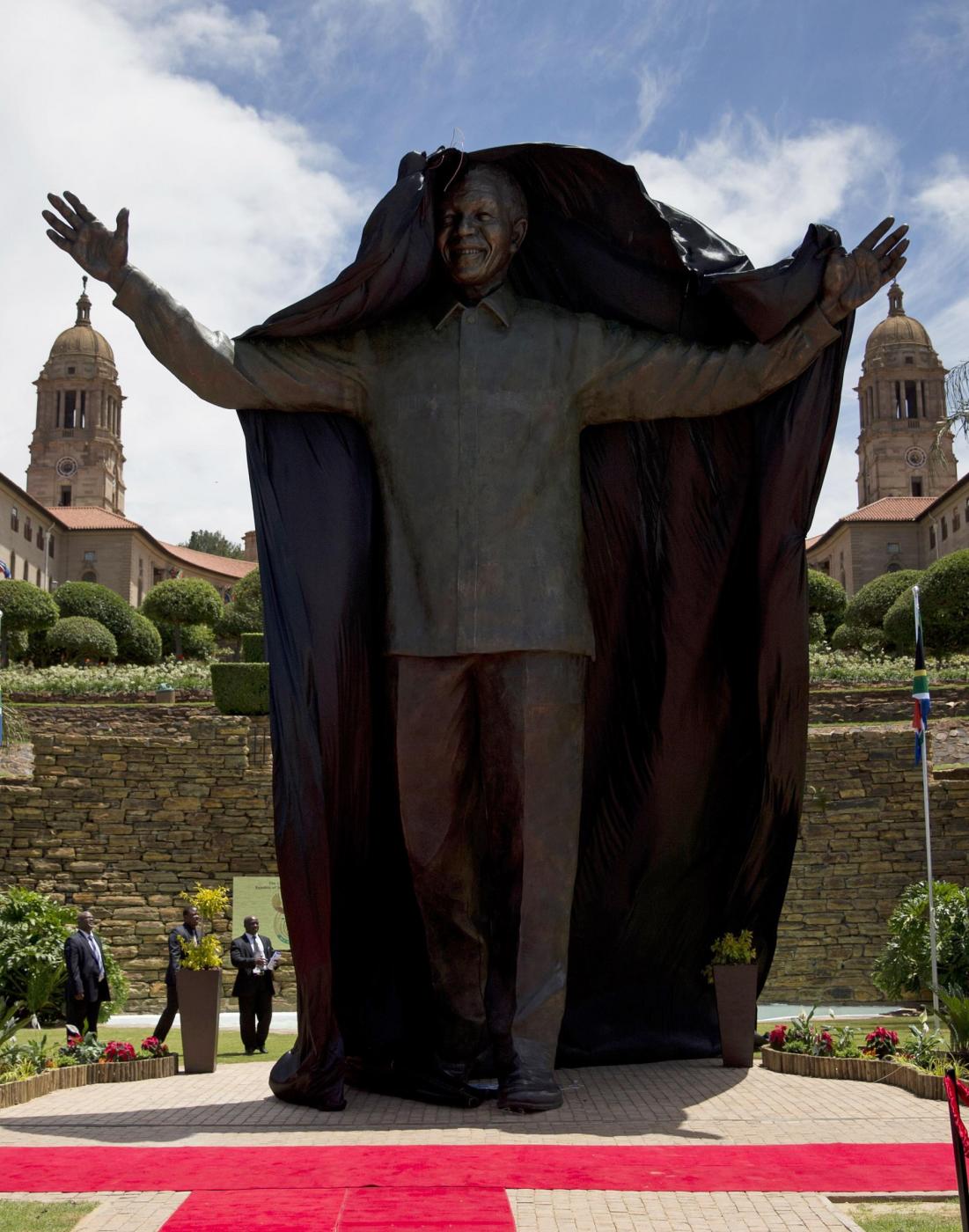 A 9 metre bronze statue of former South Africa President Nelson Mandela is unveiled by President Jacob Zuma outside Union Buildings in Pretoria, South Africa, Monday, Dec. 16, 2013. The statue was unveiled as part of the Day of Reconciliation Celebrations which occur annually on Dec. 16 at the Union Buildings, which this year fall on the structure's centenary. (AP Photo/Matt Dunham)