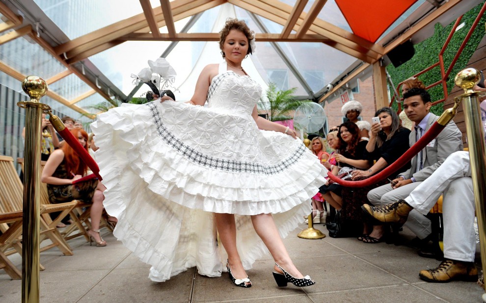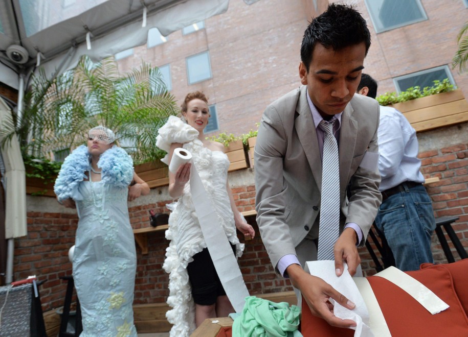 L’edizione 2014 del contest per l’abito da sposa in ”toilet paper” che si svolge a New York, è stata vinta da Susan Brennan, modella e stilista che meglio ha saputo adoperare carta e colla, gli unici strumenti concessi oltre alla carta igienica (foto Ansa)