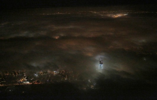 NEW YORK – La Freedom Tower spunta all’improvviso tra le nuvole, in una notte buia e tempestosa.