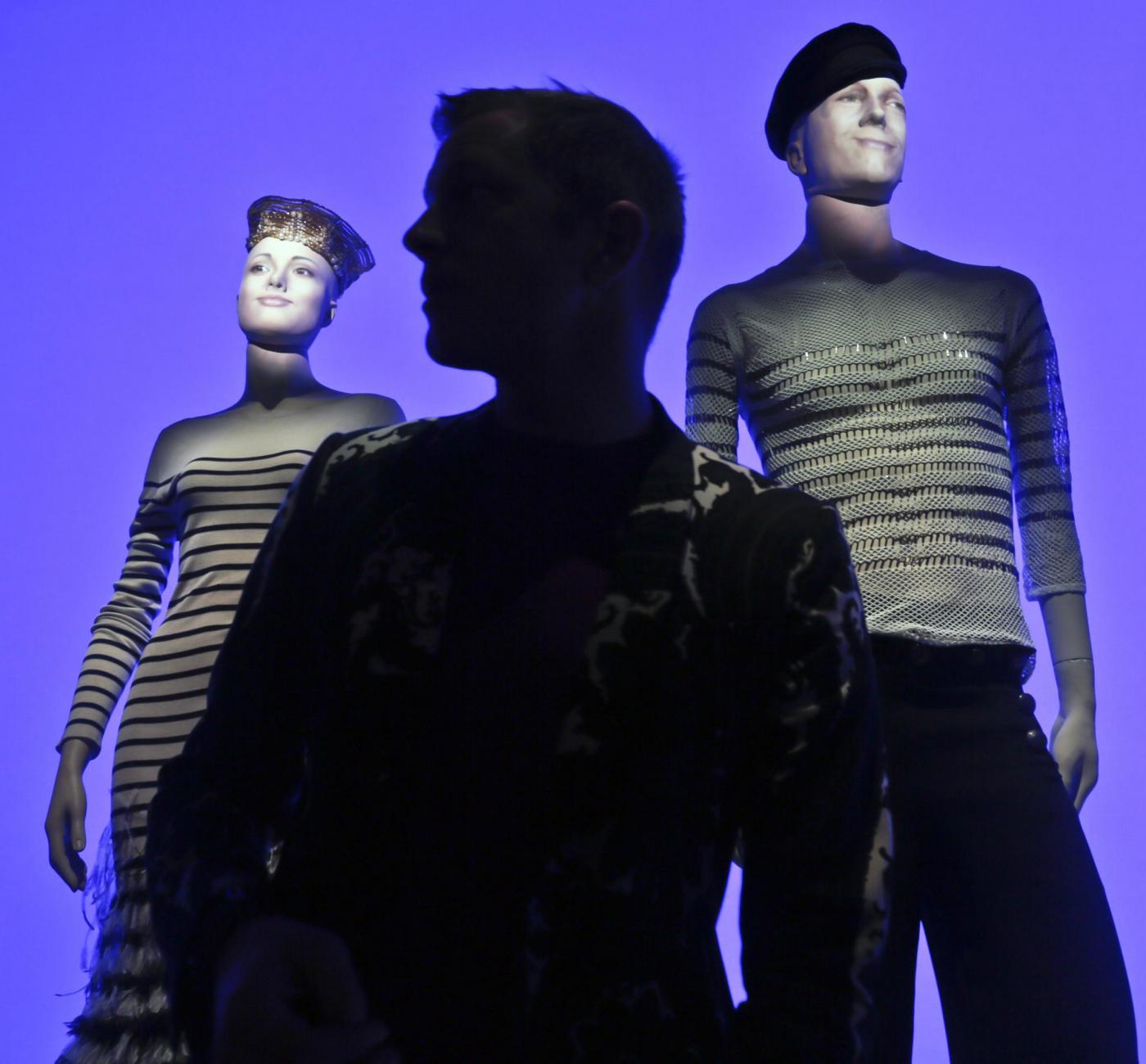 Thierry-Maxime Loriot, center, is silhouetted between mannequins, one bearing his likeness at right, during the installation of fashion designer Jean Paul Gaultier's exhibit "The Fashion World of Jean Paul Gaultier: From the Sidewalk to the Catwalk," on Tuesday, Oct. 22, 2013 at the Brooklyn Museum in New York. Loriot is the curator of the first international exhibition dedicated to the groundbreaking French couturier, integrating multimedia around seven themes tracing his influences since he emerged as a designer in the 1970s. (AP Photo/Bebeto Matthews)