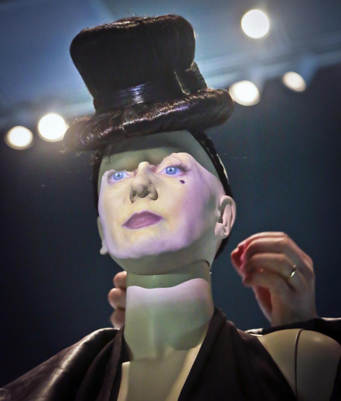 A mannequin with a face projected onto it is styled in haute couture fashion from designer Jean Paul Gaultier, during installation of his Brooklyn Museum exhibit, "The Fashion World of Jean Paul Gaultier: From the Sidewalk to the Catwalk," on Tuesday, Oct. 22, 2013 in New York. This is the first international exhibition dedicated to the groundbreaking French couturier, integrating multimedia around seven themes tracing his influences since he emerged as a designer in the 1970s. (AP Photo/Bebeto Matthews)