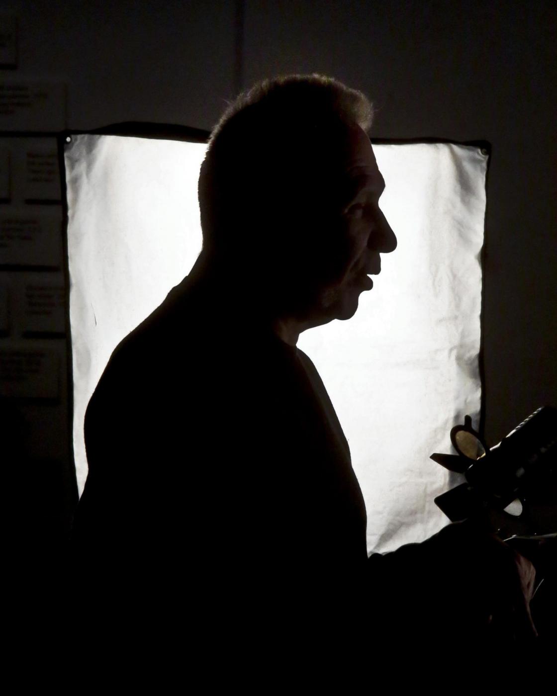 Fashion designer Jean Paul Gaultier is silhouetted in a television light after an interview about the installation of his Brooklyn Museum's "The Fashion World of Jean Paul Gaultier: From the Sidewalk to the Catwalk," on Tuesday, Oct. 22, 2013 in New York. This is the first international exhibition dedicated to the groundbreaking French couturier, integrating multimedia around seven themes tracing his influences since he emerged as a designer in the 1970s. (AP Photo/Bebeto Matthews)