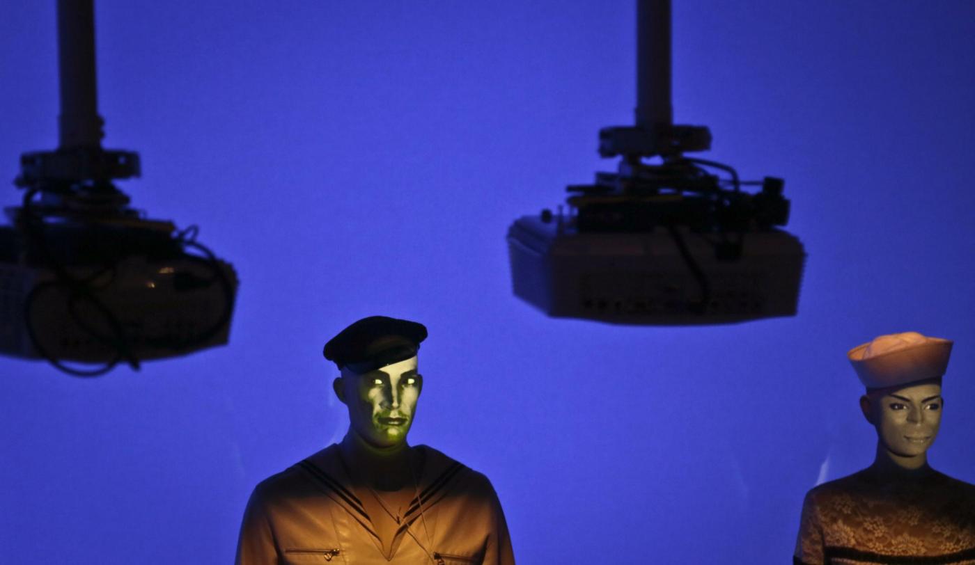 Faces are projected onto mannequins during installation of Jean Paul Gaultier's Brooklyn Museum exhibit, "The Fashion World of Jean Paul Gaultier: From the Sidewalk to the Catwalk," on Tuesday, Oct. 22, 2013 in New York. This is the first international exhibition dedicated to the groundbreaking French couturier, integrating multimedia around seven themes tracing his influences since he emerged as a designer in the 1970s. (AP Photo/Bebeto Matthews)