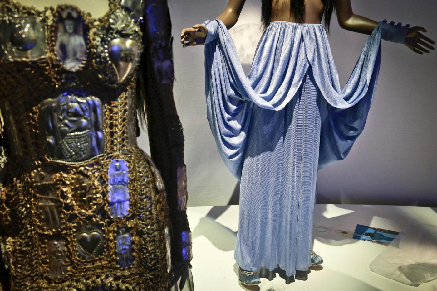 Designs from Jean Paul Gaultier are previewed during installation of his Brooklyn Museum exhibit, "The Fashion World of Jean Paul Gaultier: From the Sidewalk to the Catwalk," on Tuesday, Oct. 22, 2013 in New York. This is the first international exhibition dedicated to the groundbreaking French couturier, integrating multimedia around seven themes tracing his influences since he emerged as a designer in the 1970s. (AP Photo/Bebeto Matthews)