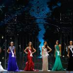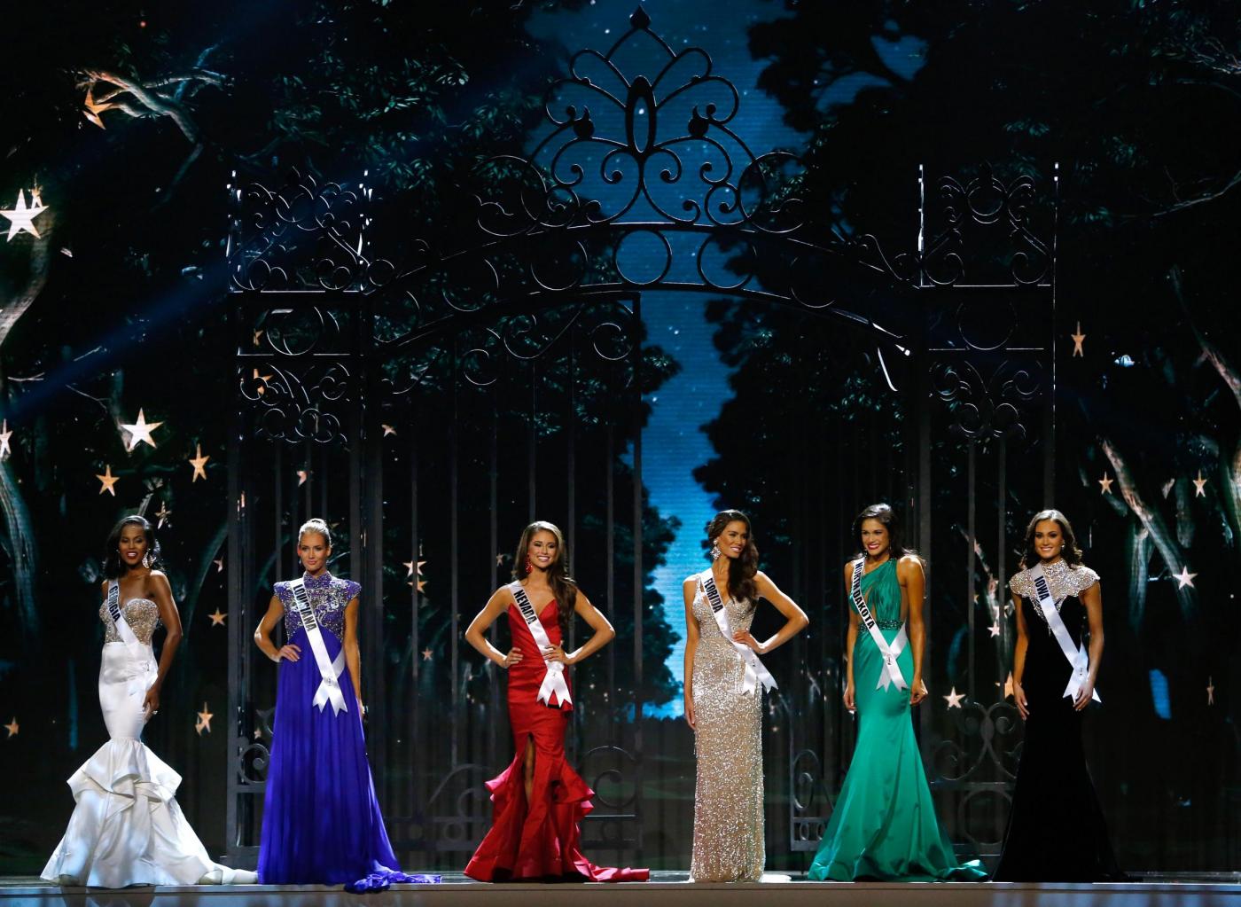 Miss Georgia USA Tiana Griggs, from left, Miss Louisiana USA Brittany Alyson Guidry, Miss Nevada USA Nia Sanchez, Miss Florida USA Brittany Oldehoff, Miss North Dakota USA Audra Mari and Miss Iowa USA Carlyn Bradarich, stand during the Miss USA pageant in Baton Rouge, La., Sunday, June 8, 2014. Sanchez would go on to win the Miss USA title. (AP Photo/Jonathan Bachman)