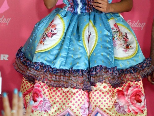 SYDNEY (AUSTRALIA) – Non è solita usare vestiti ‘normali’, ma questa volta Nicki Minaj ha davvero esagerato. L’abito scelto dalla rapper per la presentazione del suo nuovo profumo sembrava realizzato mischiando le vecchie trapunte di mamma. Era un po’ troppo caldo per l’estate bollente di Sydney, mentre sarebbe stato più appropriato al clima freddo del Regno Unito. La cantante di Trinidad era sorridente all’evento, nonostante la lite furibonda avuta su Twitter con il collega giudice di American Idol, Steven Tyler. Nicki si era offesa per un commento sulle sue qualità di giudice al talent del frontman degli Aerosmith. Tyler infatti aveva scritto che la Minaj “rispedirebbe Bob Dylan in un campo di grano se fosse un concorrente nello show”.