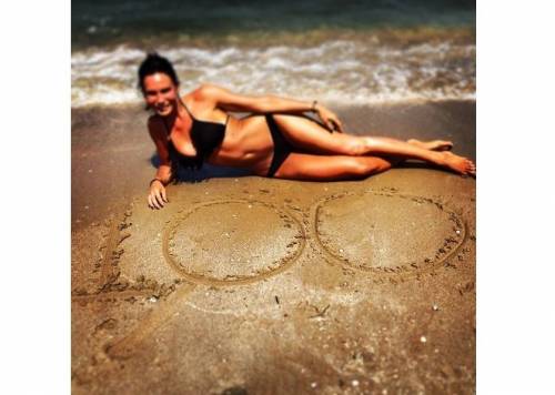 Nicole Minetti in bikini sdraiata sul bagnasciuga ringrazia i suoi follower di Instagram, che sono arrivati a quota 100 mila