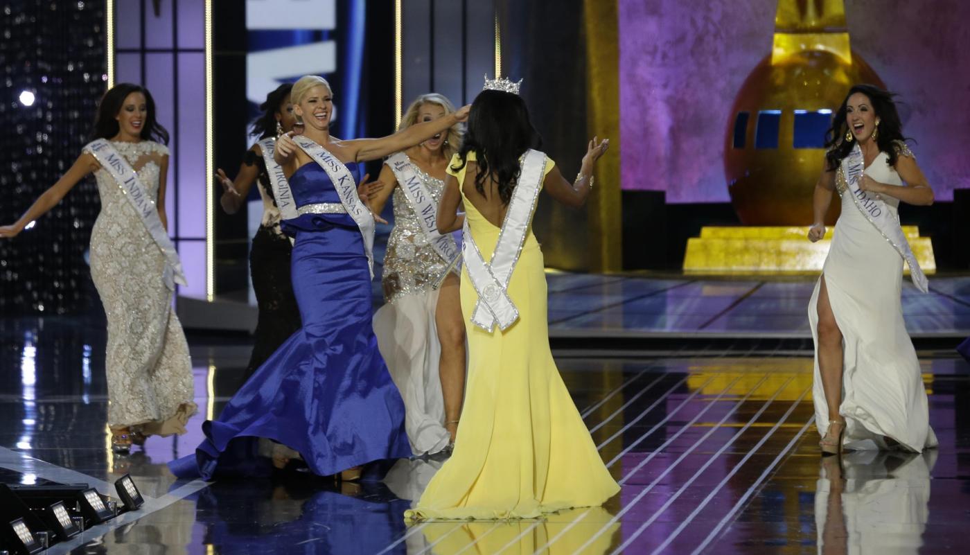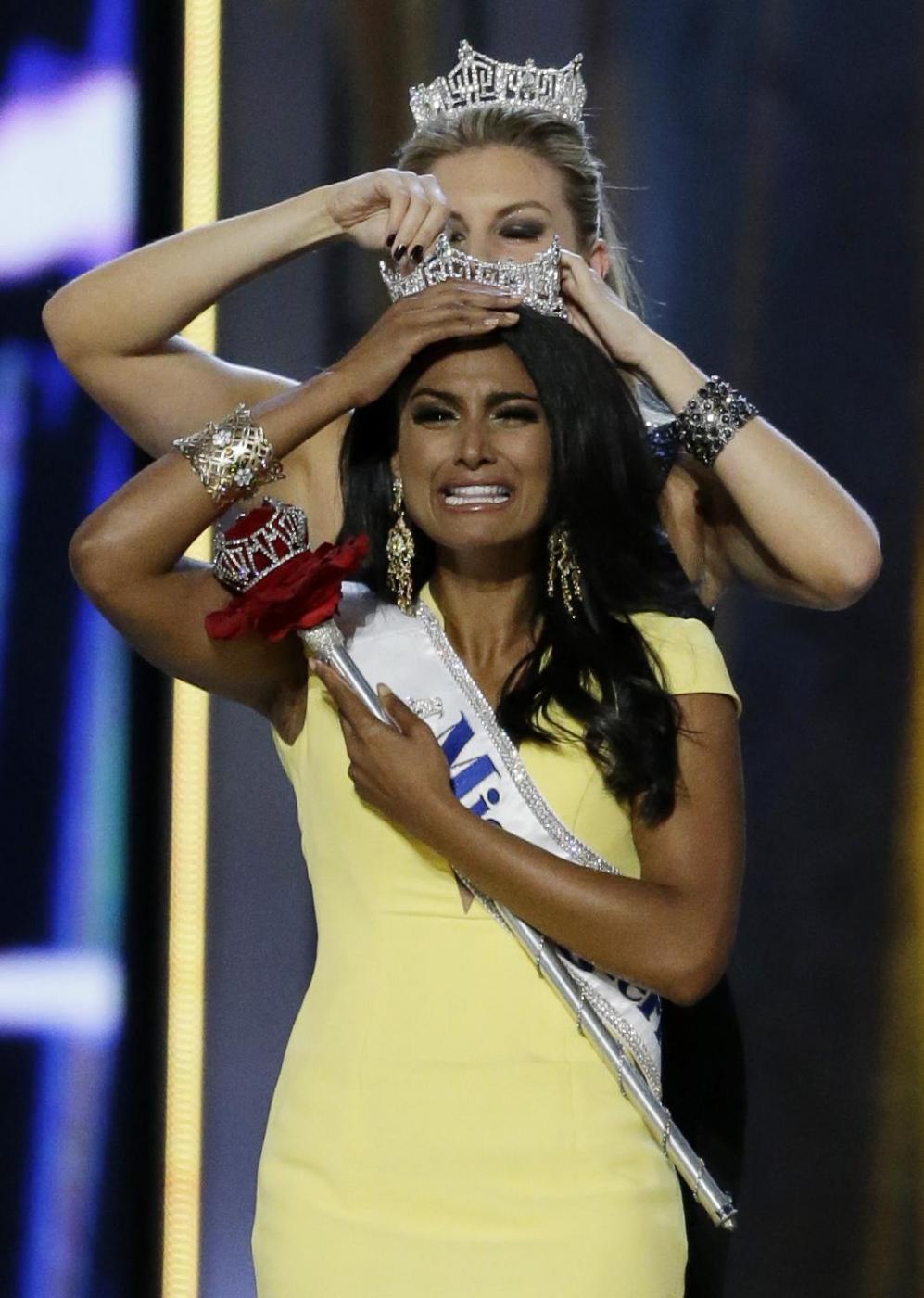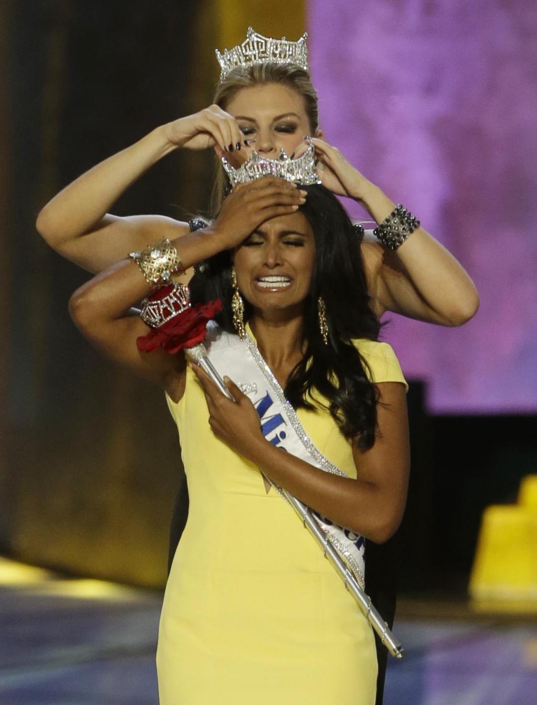 Miss New York Nina Davuluri, front, is crowned as Miss America 2014 by Miss America 2013 Mallory Hagan, Sunday, Sept. 15, 2013, in Atlantic City, N.J. (AP Photo/Mel Evans)