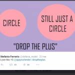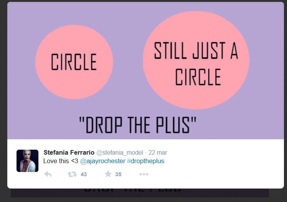 A chi non è dello stesso parere, la Ferrario mostra su Twitter un’immagine in cui è disegnato da un lato un cerchio e dall’altro un cerchio più grande, sottolineando: “Continua a rimanere solo un cerchio”. La Ferrario ha lanciato una vera e propria campagna contro questa “sotto-categoria”. L’hastag è #DropThePlus (Facciamo cadere il più). La Ferrario, sel suo messaggio su Instagram spiega lo scopo dell’iniziativa: