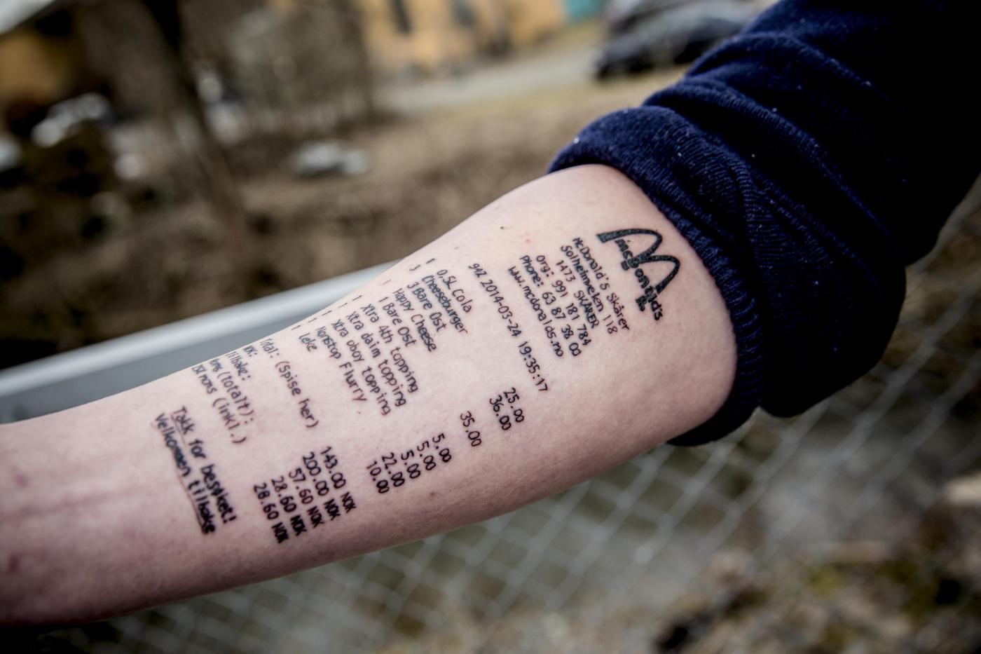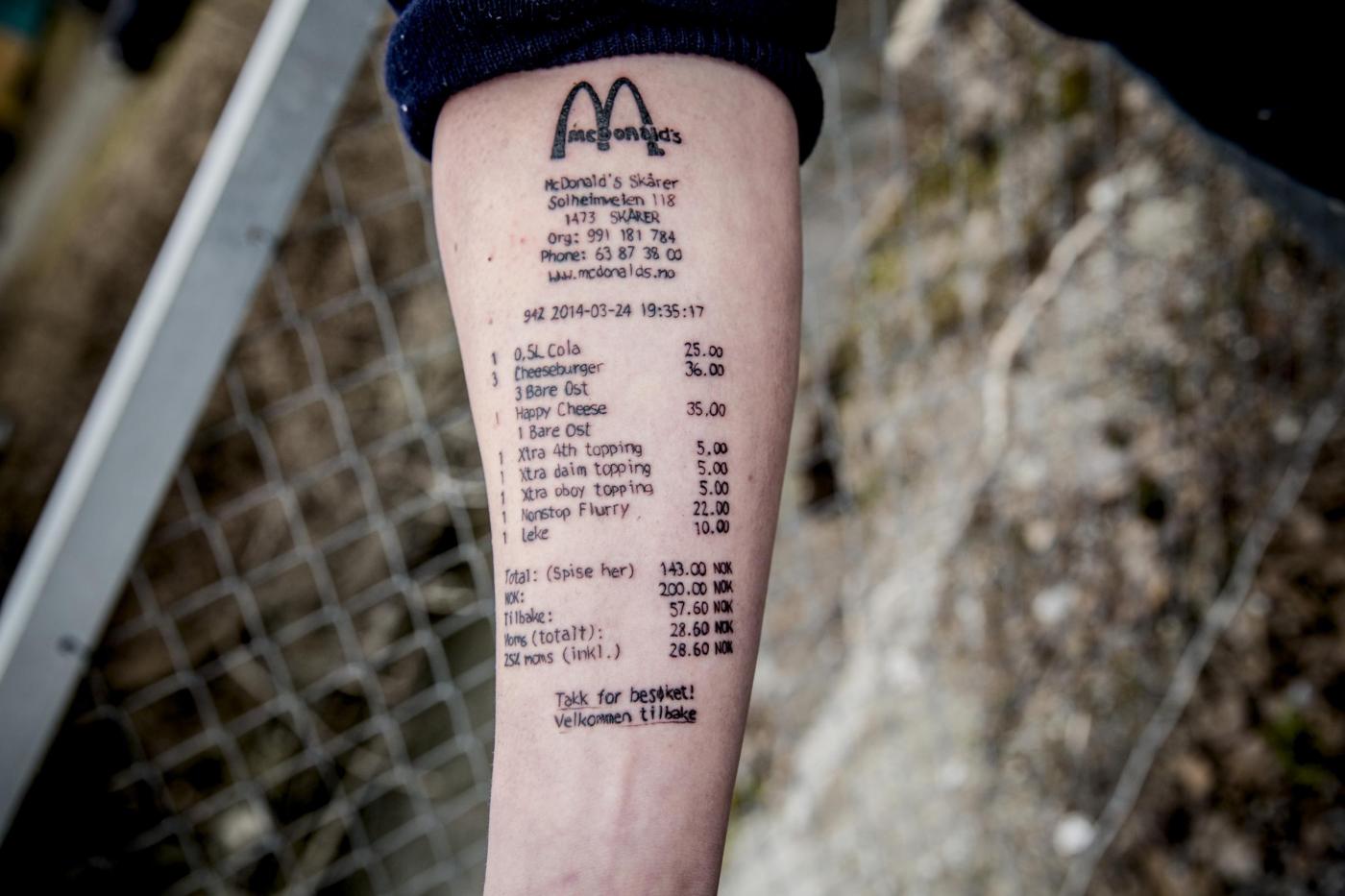 Stian Ytterdahl has had a McDonald's-bill tattooed onto his lower right arm. McDonald's in Norway deny any involvement, they say it is not a marketing stunt but it obviously reflects a very loyal customer. Some of Stians friends arranged for the tattoo, Stian himself says that in 50 years time or so he and his grandchildren may be able to compare prices at McDonald's. Stian Lysberg Solum / NTB scanpix LaPresse -- Only Italy