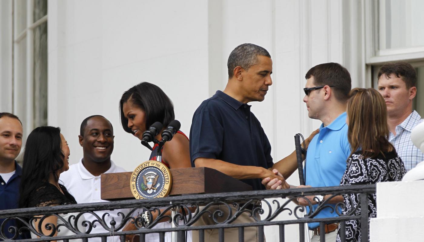 Obama ha reso omaggio a “questa generazione di eroi” per il loro lavoro e per i loro sacrifici a difesa delle libertà americane, ringraziando i militari per avere catturato Osama bin Laden e per gli sforzi per l’uscita dall’Afghanistan. La nazione “ci sarà sempre per voi, così come voi ci siete stati per lei”, ha detto Obama, aggiungendo che quella è la sua promessa, la stessa dell’America. In seguito gli Obama hanno stretto la mano ai soldati presenti e hanno fatto delle foto con loro (foto Ap/LaPresse)