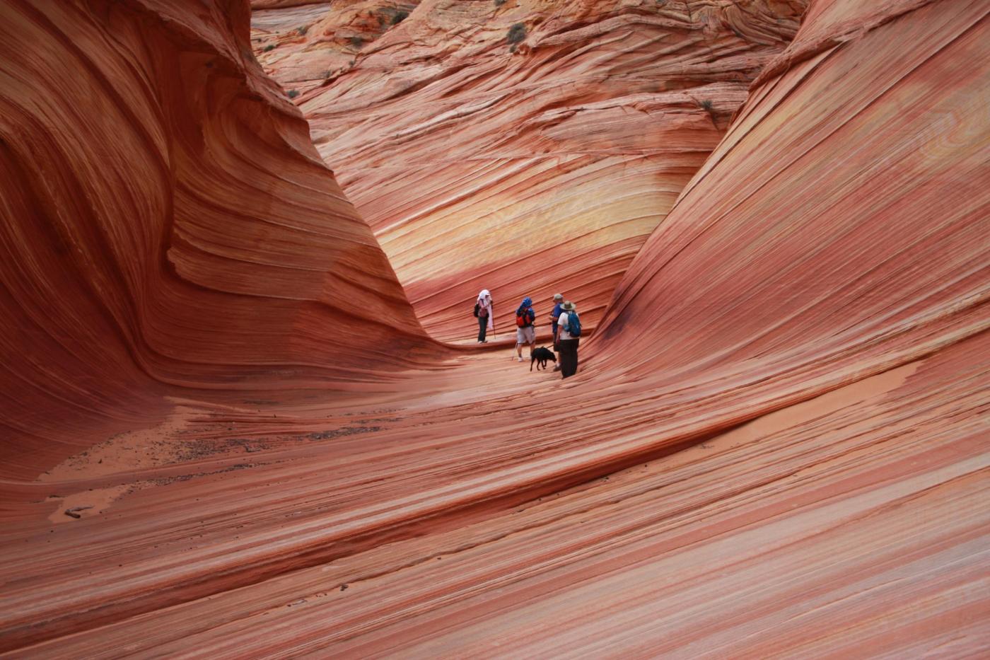This May 28, 2013 photo shows hikers pausing to view a rock formation known as The Wave in the Vermilion Cliffs National Monument in Arizona. The U.S. Bureau of Land Management limits the number of permits for hikers to 20 a day in order to preserve the backcountry wilderness experience and protect the sandstone formation. The permits are issued by lottery, half of them four months in advance through an online lottery and 10 by a live drawing of bingo balls the day before. (AP Photo/Brian Witte)