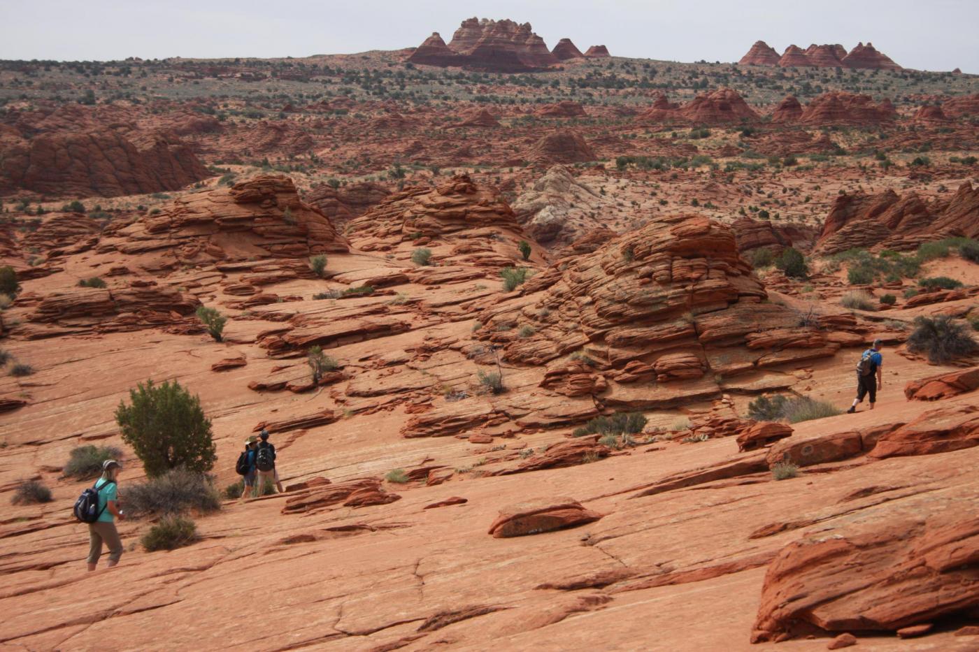 This May 28, 2013 photo shows hikers walking on rocky terrain for a 3-mile trip to The Wave rock formation in the Vermilion Cliffs National Monument. People who make the hike are advised to bring at least a gallon of water for the desert backcountry journey that begins in southern Utah and crosses over the border into Arizona. (AP Photo/Brian Witte)