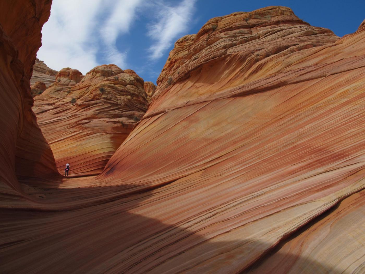 This May 28, 2013 photo shows a hiker on a rock formation known as The Wave in the Vermilion Cliffs National Monument in Arizona. The U.S. Bureau of Land Management limits the number of permits for hikers to 20 a day in order to preserve the backcountry wilderness experience and protect the sandstone formation. (AP Photo/Brian Witte)