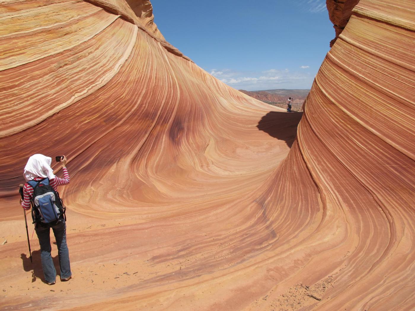 This May 28, 2013 photo shows a hiker taking a photo on a rock formation known as The Wave in the Vermilion Cliffs National Monument in Arizona. The U.S. Bureau of Land Management limits the number of permits for hikers to 20 a day in order to preserve the backcountry wilderness experience and protect the sandstone formation. (AP Photo/Brian Witte)