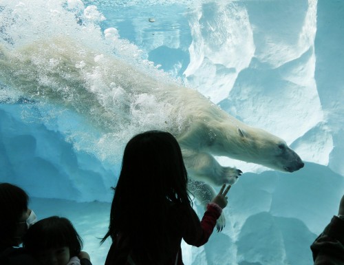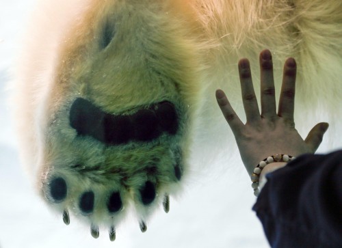 epa03621283 A polar bear puts its left back paw in the water on the glass as a woman compares its size with her hand at Ueno Zoo in Tokyo, Japan, 13 March 2013. The bear has been classified as a vulnerable species. EPA/KIMIMASA MAYAMA