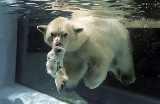 epa03621284 A polar bear puts its nose into a plastic bag, blown by strong wind into the water, at Ueno Zoo in Tokyo Japan, 13 March 2013. The bear has been classified as a vulnerable species. EPA/KIMIMASA MAYAMA