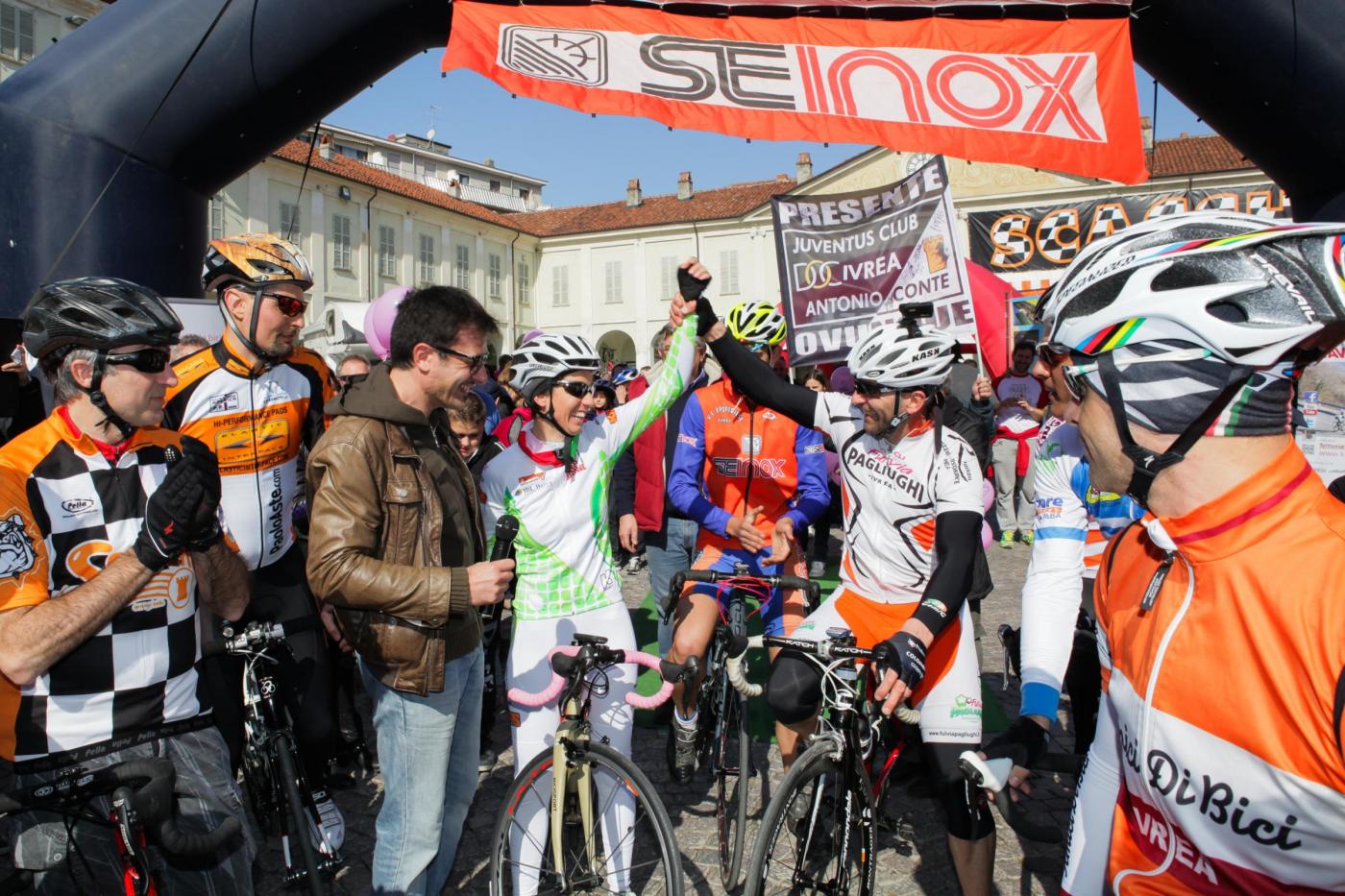 IVREA (TORINO) – Grande accoglienza la mattina di sabato 8 marzo, in piazza Ottinetti a Ivrea per la ciclista 33enne Paola Gianotti, che è partita per tentare il record di traversata in bicicletta dei cinque continenti, attualmente detenuto dalla greca Juliana Buhring che lo ha compiuto in 152 giorni.