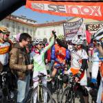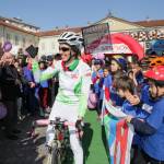 Foto Andrea Negro / LaPresse 08 03 2014 Ivrea (Italia) Ivrea, piazza gremita per la partenza di Paola Gianotti, che farà il giro del mondo in bicicletta Nella foto: Paola Gianotti saluta il pubblico alla partenza in Piazza Ottinetti Foto Andrea Negro / LaPresse 08 March 2014 Ivrea (Italy) Paola Gianotti, 32, leaving her home in Ivrea will attempt to replicate the success of Greek cyclist Juliana Bhuring, who cycled the same distance around the world in 145 days in 2012