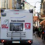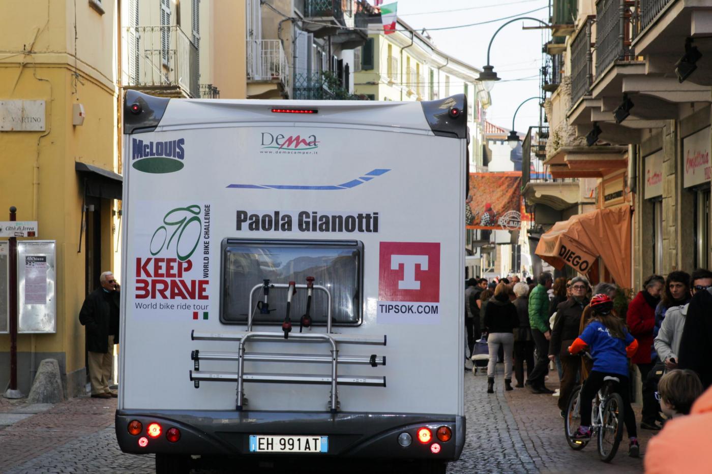 Foto Andrea Negro / LaPresse 08 03 2014 Ivrea (Italia) Ivrea, piazza gremita per la partenza di Paola Gianotti, che farà il giro del mondo in bicicletta Nella foto: il camper che la seguirà durante il giro del mondoFoto Andrea Negro / LaPresse 08 March 2014 Ivrea (Italy) Paola Gianotti, 32, leaving her home in Ivrea will attempt to replicate the success of Greek cyclist Juliana Bhuring, who cycled the same distance around the world in 145 days in 2012