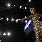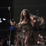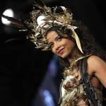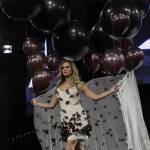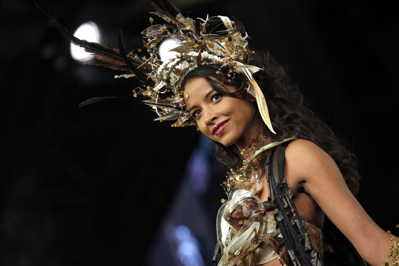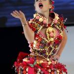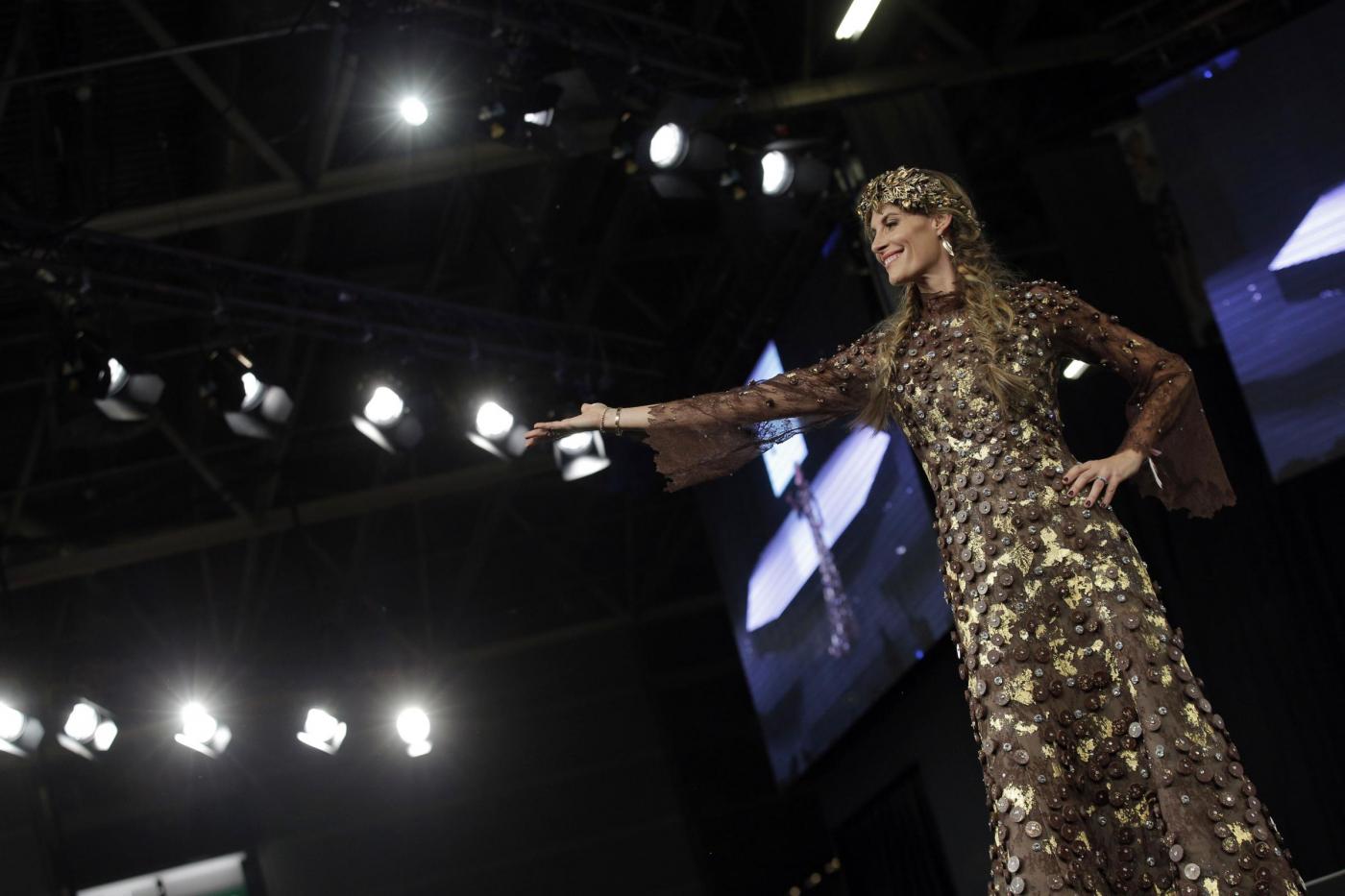 French TV host Clara Morgane presents a chocolate studded dress during a show as part of the chocolate fair in Paris, Tuesday, Oct. 28, 2014. The fair starts on Oct. 29 and ends on Nov.2. (AP Photo/Christophe Ena)