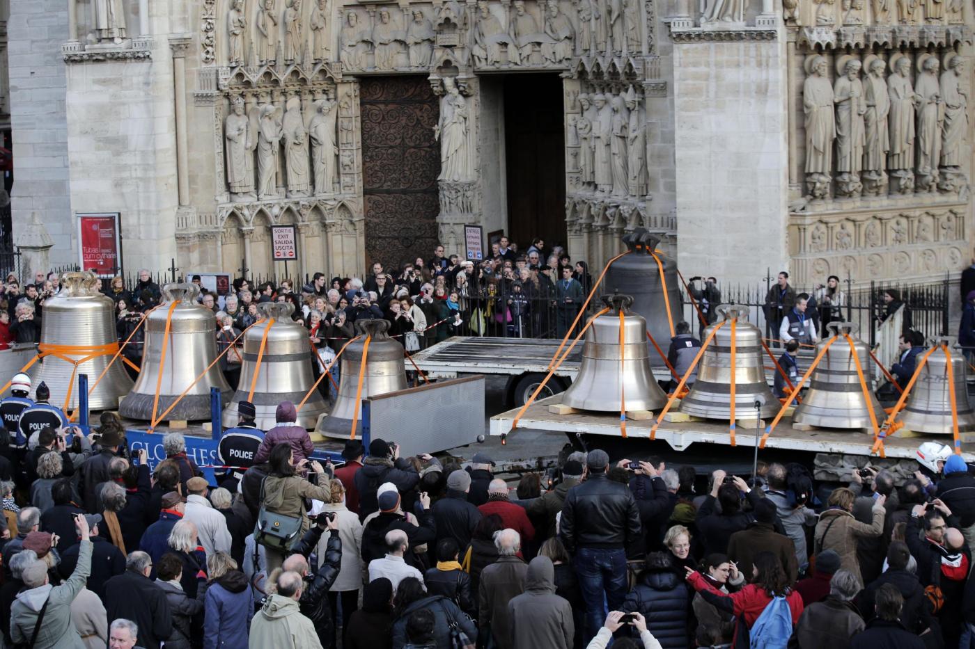 People gather around new bells in front of the Notre Dame cathedral, in Paris, Thursday, Jan. 31, 2013. Nine bronze bells have made their way on flatbed trucks from a Normandy foundry to what is hoped will be their home for centuries to come, Notre Dame Cathedral, helping the medieval edifice to rediscover its historical harmony. (AP Photo/Christophe Ena)