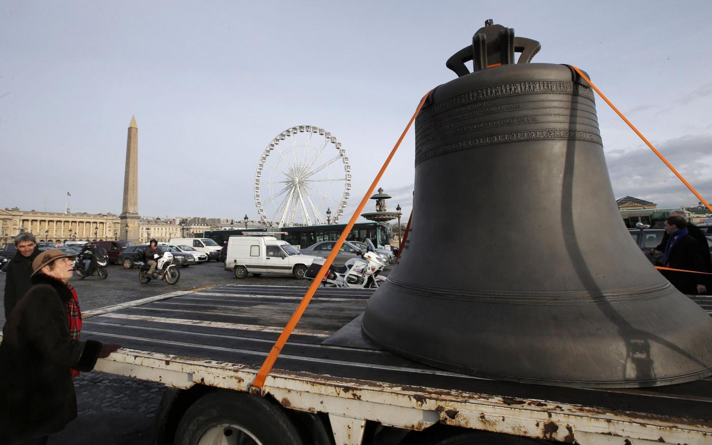 A new bell known as Gabriel bound for the Notre Dame cathedral is transported on a flatbed truck past the Concorde Plazza in Paris, Thursday, Jan. 31, 2013. Nine enormous bronze bells have made their way on flatbed trucks from a Normandy foundry to what is hoped will be their home for centuries to come, Notre Dame Cathedral, helping the medieval edifice to rediscover its historical harmony. (AP Photo/Francois Mori)