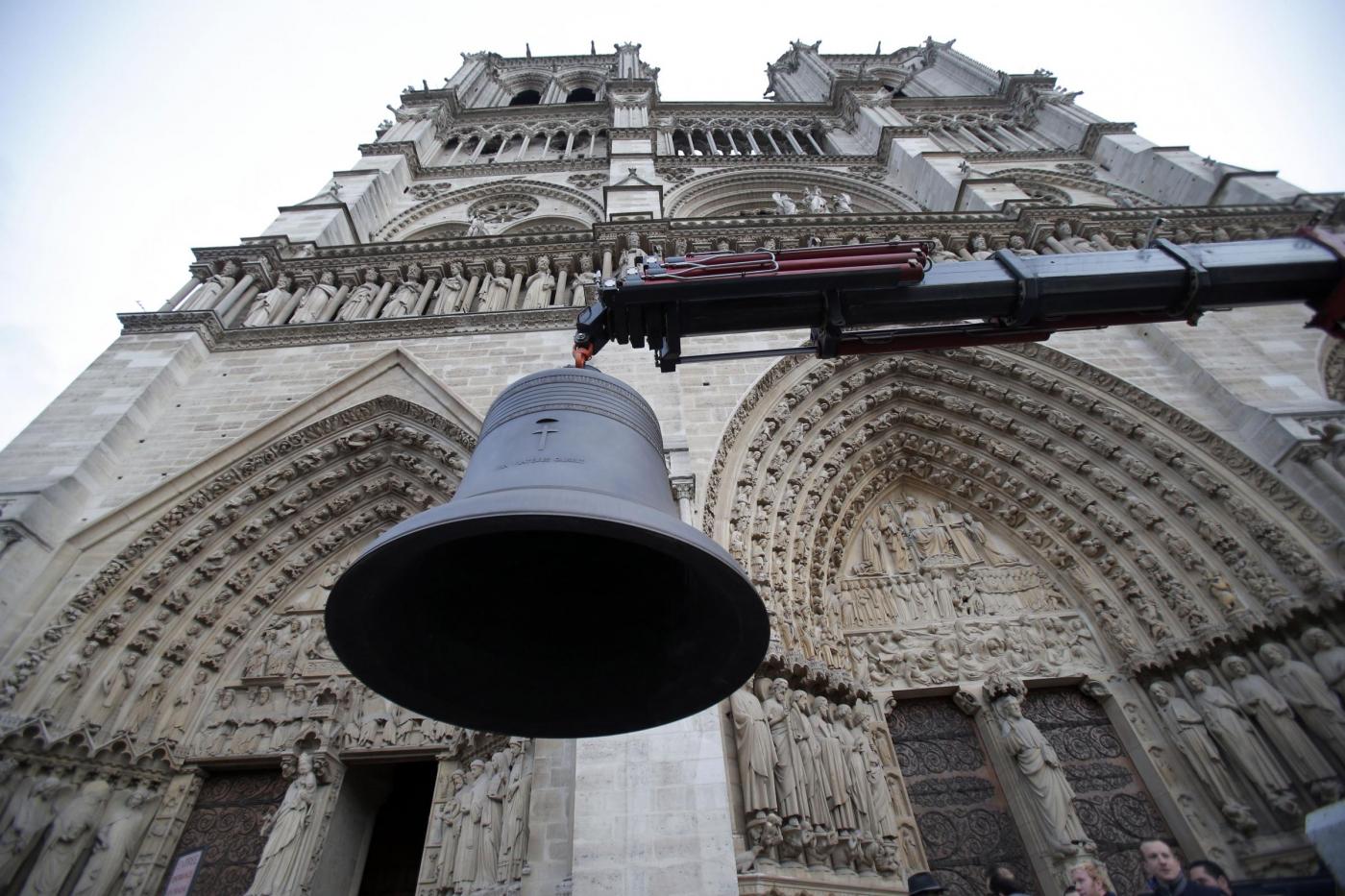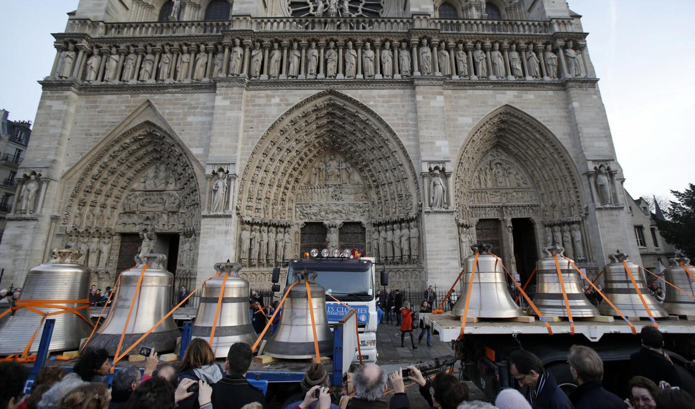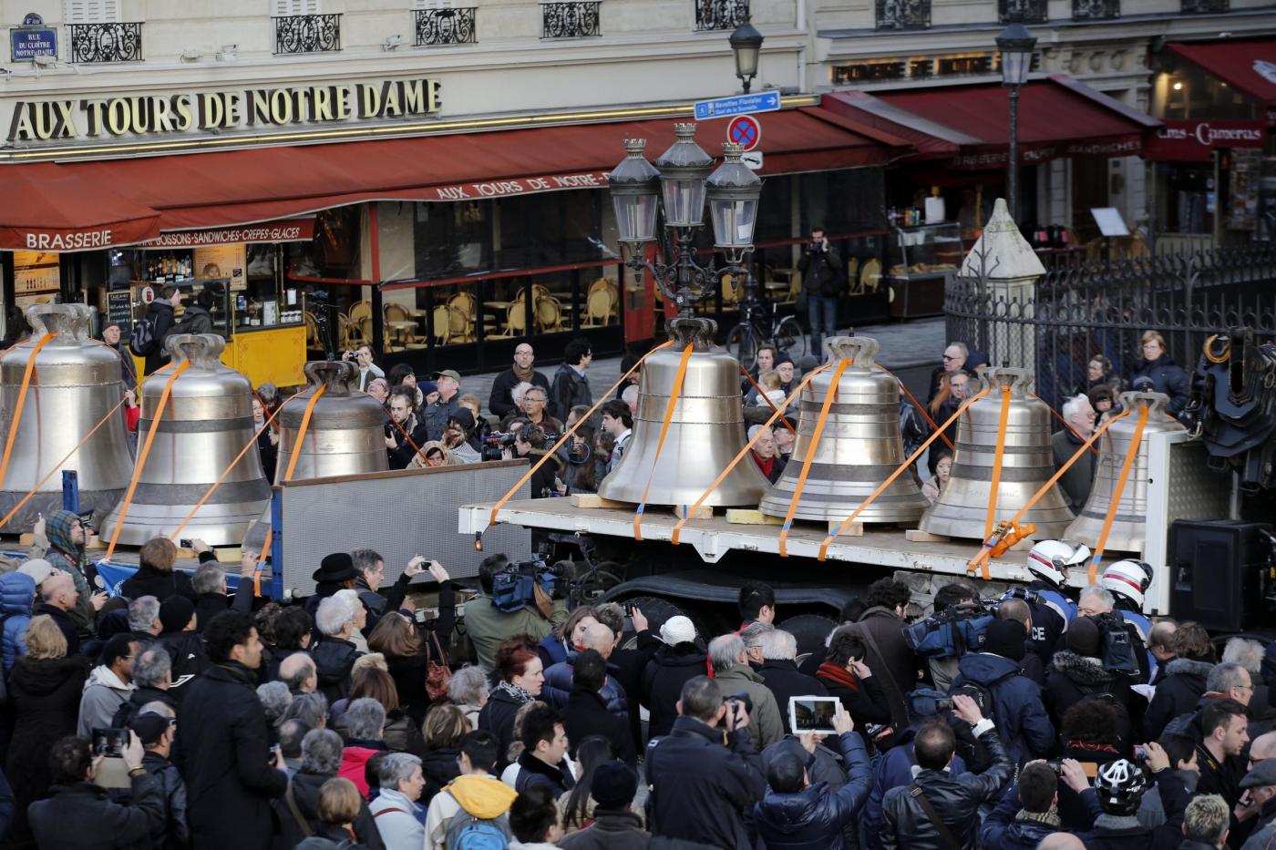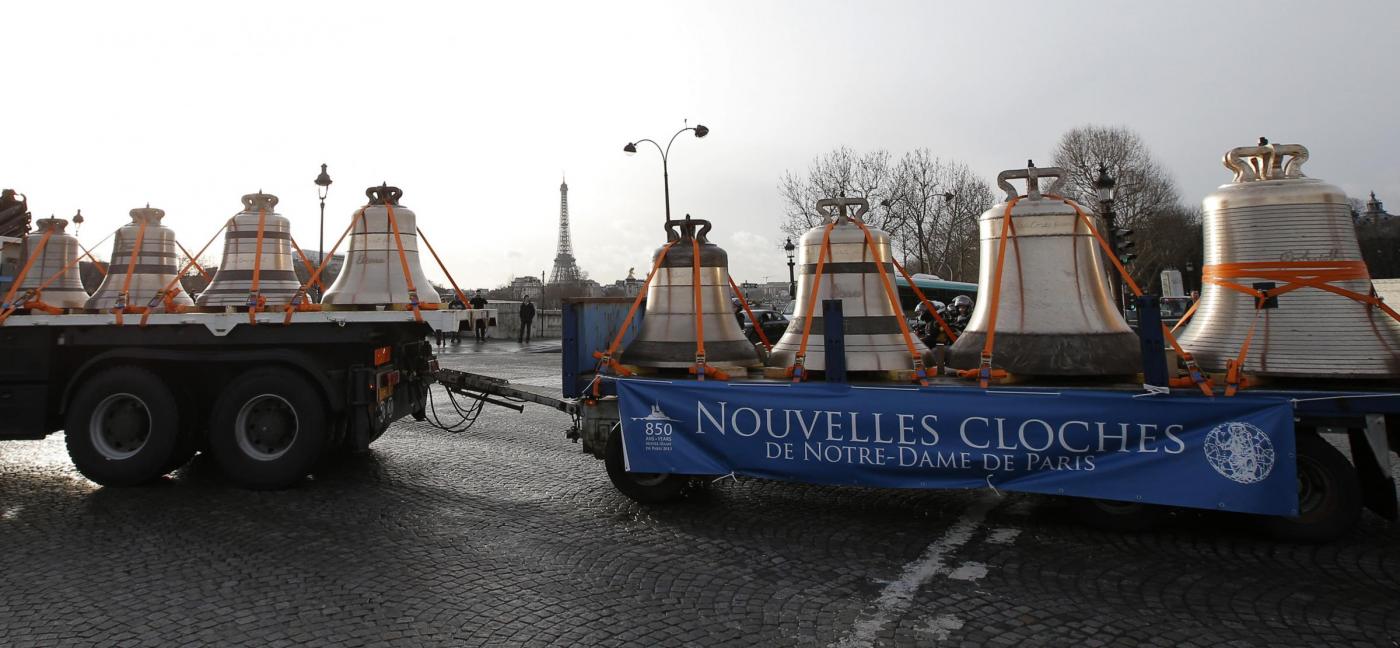 PARIGI – Notre Dame de Paris ha finalmente le sue nuove campane: dalle fonderie di Cornille-Havard, a Villedieu-les-Poeles, sulla Manica, il convoglio ha viaggiato stamani su due camion rimorchio di venti metri ciascuno per raggiungere la capitale nel primo pomeriggio. Le 9 campane, piu’ melodiose, realizzate in occasione dei festeggiamenti per l’850 esimo anniversario della cattedrale, sono state posizionate nella navata della chiesa dove resteranno esposte al pubblico fino al 28 febbraio.