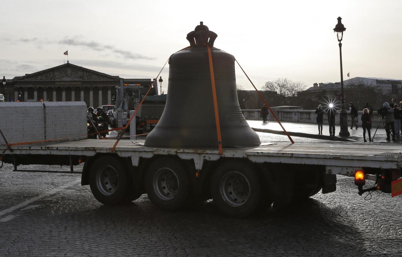 A new bell known as Gabriel bound for the Notre Dame cathedral is transported on a flatbed truck near the Concorde Plazza in Paris, Thursday, Jan. 31, 2013. Nine enormous bronze bells have made their way on flatbed trucks from a Normandy foundry to what is hoped will be their home for centuries to come, Notre Dame Cathedral, helping the medieval edifice to rediscover its historical harmony. (AP Photo/Francois Mori)