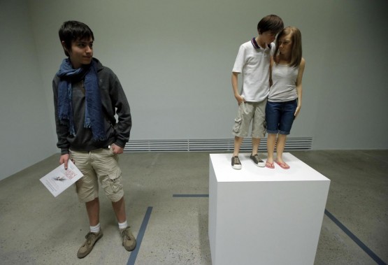 A visitor, left, looks at a sculpture entitled "Young Couple, 2013" by Australian artist Ron Mueck during the opening day for his exhibition at the Fondation Cartier pour l'Art Contemporain in Paris, Tuesday April 16, 2013. The exhibition will run from April 16 to September 29, 2013. (AP Photo/Francois Mori)