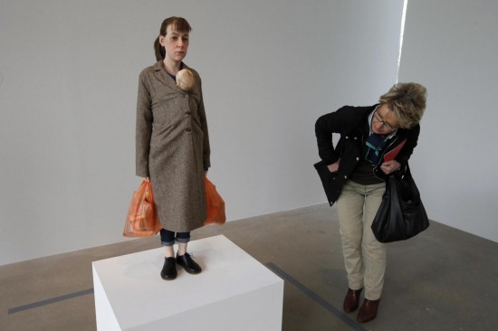 A visitor looks at a sculpture entitled "Woman With Shopping, 2013" by Australian artist Ron Mueck during the opening day for his exhibition at the Fondation Cartier pour l'Art Contemporain in Paris, Tuesday April 16, 2013. The exhibition will run from April 16 to September 29, 2013. (AP Photo/Francois Mori)