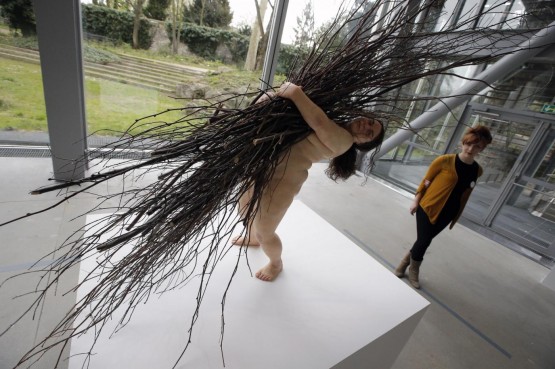 A woman, right, walks by a sculpture entitled "Woman With Sticks, 2009" by Australian artist Ron Mueck during the opening day for his exhibition at the Fondation Cartier pour l'Art Contemporain in Paris, Tuesday April 16, 2013. The exhibition will run from April 16 to September 29, 2013. (AP Photo/Francois Mori)