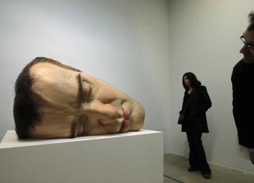 Visitors look at a sculpture entitled "Mask II, 2002" by Australian artist Ron Mueck during the opening day for his exhibition at the Fondation Cartier pour l'Art Contemporain in Paris, Tuesday April 16, 2013. The exhibition will run from April 16 to September 29, 2013. (AP Photo/Francois Mori)