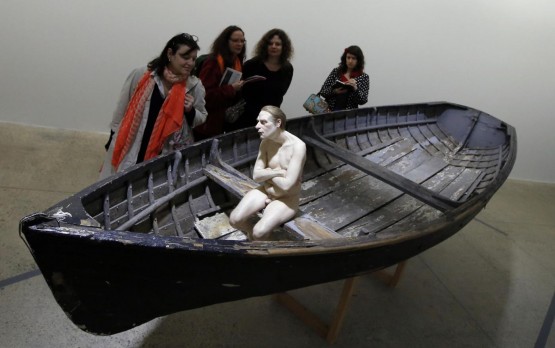 Visitors look at a sculpture entitled "Man In A Boat, 2002" by Australian artist Ron Mueck during the opening day for his exhibition at the Fondation Cartier pour l'Art Contemporain in Paris, Tuesday April 16, 2013. The exhibition will run from April 16 to September 29, 2013. (AP Photo/Francois Mori)
