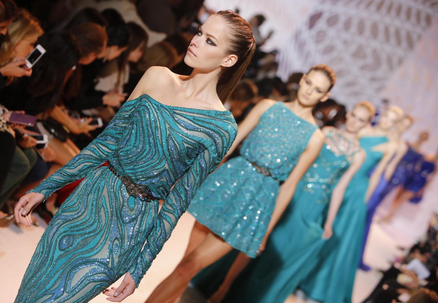 Models present creations for Zuhair Murad's fall-winter 2014-2015 Haute Couture fashion colllection in Paris, France, Thursday, July 10, 2014. (AP Photo/Francois Mori)